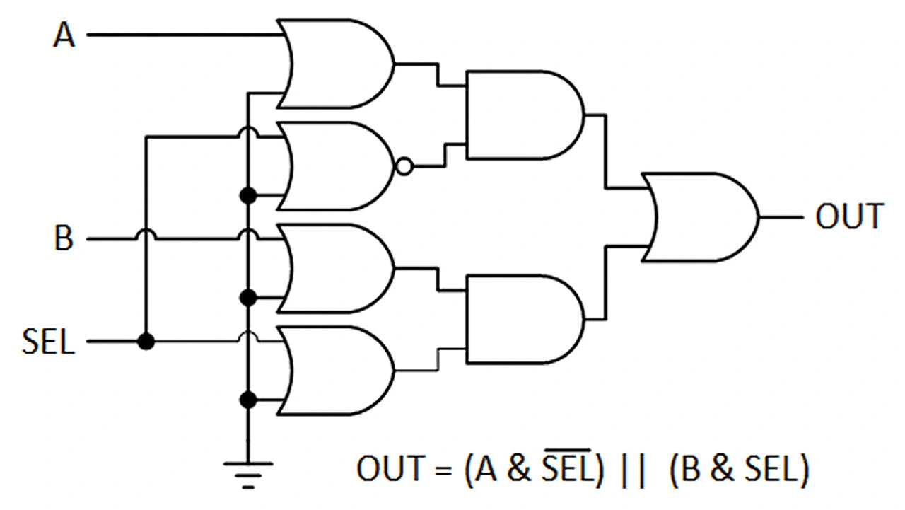 Zur Steuerung des Multiplexers wird ein Bit des SR-Ports als Select-Leitung verwendet. Die logische Implementierung ist in Bild 3 dargestellt.