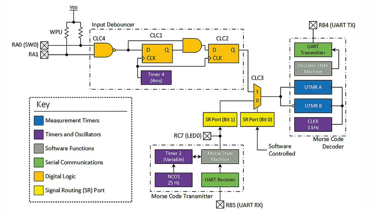Stattdessen erlaubt die CLC-Multiplexer-Konfiguration dem Programm, die Eingänge zu ändern, ohne jedes Mal eine Entsperrsequenz durchlaufen zu müssen. Die Morsecode-Demo von Bild 4 für die PIC18F56Q71-Familie von Microchip nutzt diesen Anwendungsfall. Die Demo erstellt einen einfachen Morsecode-Sender und -Empfänger, wobei der Multiplexer zur Auswahl zwischen dem Senderausgang und einem externen Eingangssignal für den Empfang dient.