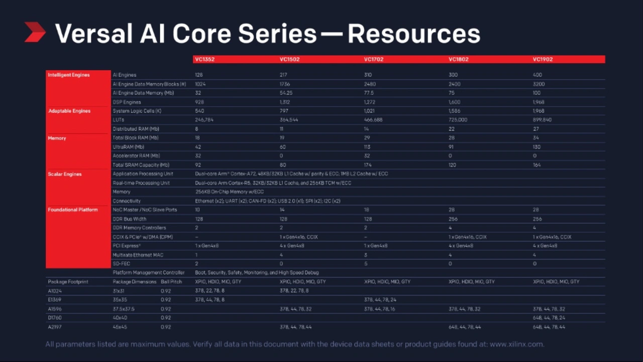 Die Versal AI Core Serie ist optimiert für Cloud-, Netzwerk- und autonome Technologien und bietet den höchsten verfügbaren Bereich an KI- und Workload-Beschleunigung. Die Versal AI Core Serie verfügt über fünf Devices mit 128 bis 400 KI-Engines. Die Serie umfasst Dual-Core Arm Cortex-A72 Anwendungsprozessoren, Dual-Core Arm Cortex-R5 Echtzeitprozessoren, 256KB On-Chip-Speicher mit ECC und mehr als 1.900 DSP-Engines. Es beinhaltet auch mehr als 1,9 Millionen Systemlogikzellen in Kombination mit mehr als 130 MB UltraRAM, bis zu 34 MB Block-RAM und 28 MB verteiltem RAM und 32 MB neuen Accelerator-RAM-Blöcken, auf die von jeder Engine aus direkt zugegriffen werden kann und die einzigartig für die Versal AI-Serie sind. Die Serie umfasst auch PCIe Gen4 mit 8- und 16-Leitungen und CCIX-Host-Schnittstellen, energieoptimierte 32G SerDes, bis zu 4 integrierte DDR4-Speichercontroller, bis zu 4 mehrstufige Ethernet-MACs, 650 Hochleistungs-I/Os für MIPI D-PHY, NAND, Speicher-Schnittstellen und LVDS sowie 78 multiplexte I/Os zum Anschluss externer Komponenten und mehr als 40 HD-I/Os für 3,3V-Schnittstellen. All dies ist durch ein Network-On-Chip (NoC) mit bis zu 28 Master/Slave-Ports verbunden.