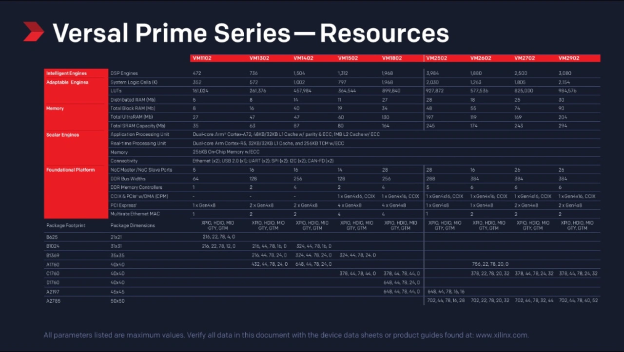 Die Versal Prime-Serie wurde für eine breite Anwendbarkeit in verschiedenen Märkten entwickelt und ist für die Konnektivität und Beschleunigung einer Vielzahl von Workloads optimiert. Diese Midrange-Serie besteht aus neun Derivaten, die jeweils Dual-Core Arm Cortex-A72 Anwendungsprozessoren, Dual-Core Arm Cortex-R5 Echtzeitprozessoren, 256KB On-Chip-Speicher mit ECC und mehr als 4.000 DSP-Engines beinhalten. Es beinhaltet auch mehr als 2 Millionen Systemlogikzellen in Kombination mit mehr als 200 MB UltraRAM, mehr als 90 MB Block-RAM und 30 MB verteiltem RAM zur Unterstützung benutzerdefinierter Speicherhierarchien. Die Serie umfasst auch PCIe Gen4 mit 8- und 16-Leitungen und CCIX-Host-Schnittstellen, energieoptimierte 32 Gigabit pro Sekunde SerDes und 58 Gigabit pro Sekunde PAM4 SerDes, bis zu 6 integrierte DDR4-Speichercontroller, bis zu 4 mehrstufige Ethernet-MACs, 700 Hochleistungs-I/Os für MIPI D-PHY-, NAND-Schnittstellen und LVDS, plus 78 multiplexte I/Os zum Anschluss externer Komponenten und mehr als 40 HD-I/Os für 3,3V-Schnittstellen. Auch bei dieser Familie ist all dies ist durch ein Network-On-Chip (NoC) mit bis zu 28 Master/Slave-Ports verbunden.