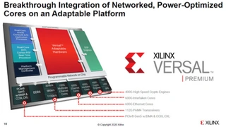 Unter der Bezeichung »Versal« fasst Xilinx seine programmierbaren Logikbausteine der Adaptive Compute Acceleration Plattform (ACAP) zusammen, eine neue Kategorie von heterogenen Compute-Bausteinen. Auf der Basis eines 7-nm-Prozesses von TSMC gefertigt, kombiniert Versal Premium die Software-Programmierbarkeit mit dynamisch konfigurierbarer Hardware-Beschleunigung und vordefinierten Vernetzungs- und Sicherheitsfunktionen. Die Versal Premium Baureihe bietet einen dreifach höheren Durchsatz als die gegenwärtige FPGA-Generation (Virtex Ultrascale+ in 16 nm), sowie eingebaute Ethernet-, Interlaken- und Kryptographie-Engines, die die Realisierung schneller und sicherer Netzwerke ermöglichen. Die neue Serie verdoppelt die Compute-Dichte derzeit eingesetzter Mainstream-FPGAs und liefert die Adaptierbarkeit, um mit zunehmend diversen und sich weiter entwickelnden Cloud- und Netzwerk-Workloads Schritt zu halten.