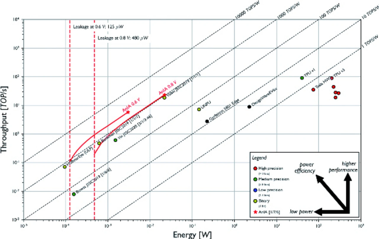 Mit ANIA hat das Imec jetzt einen Demonstrator-Chip präsentiert, der beweist, wie leistungsfähig AiMC ist. Laut Dr. Ioannis Papistas, R&D-Ingenieur beim Imec, erfolgte die Implementierung auf Basis des 22FDX-Prozesses von GlobalFoundries. Der Test-Chip hat eine Größe von 4 mm2, das eigentliche analoge Makro ist nur 2 mm2 groß. Es wurden 1024 Eingangssignale ins Makro und 512 Ausgangssignale realisiert.