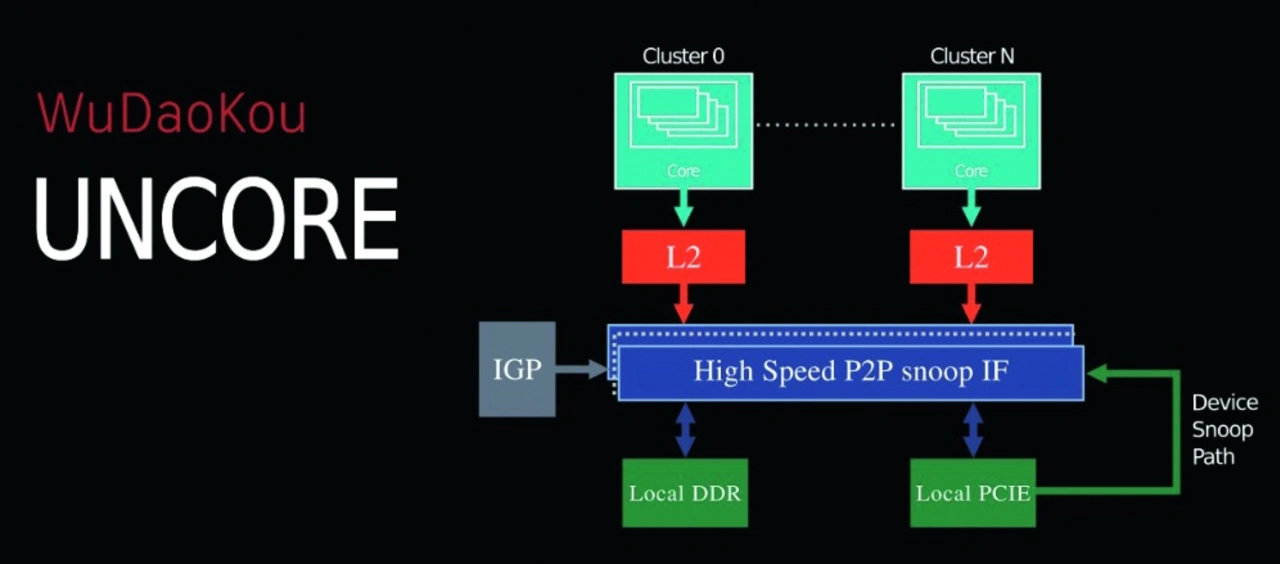 WuDaoKou ist das erste Design, das den heutigen x86-Mikroprozessoren ähnelt, indem es vom Front-Side-Bus (FSB) befreit wurde. Zuvor integrierte der Chipsatz die Southbridge und Northbridge (Bild 1). Ein neuer Uncore enthält jetzt den Speichercontroller sowie alle E/A-PHYs und die Speicher- und Cache-Arbitration (Bild 2).