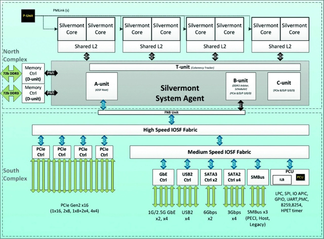 Zhaoxin gibt die in Tabelle 2 ersichtlichen SPEC-CPU-2006-Ergebnisse an. Ein Vergleich wurde mit Intels Microserver-Chip Atom C2750 vorgenommen (Bild 4), der noch auf der alten Atom-Mikroarchitektur Silvermont basiert, in einem 22-nm-Prozess gefertigt wird und anders als WuDao-Kou kein Multithreading unterstützt. Da unklar ist, welche Optimierungen Zhaoxin bei seinen Angaben gemacht hat, wurden für den Atom die Basiswerte verwendet. Sowohl im Single-Thread- (SPEC...) als auch im Multi-Core-Modus (SPEC..._rate) schlägt die 8-Core-Variante KX-U5680 bei Integer- (int) und Gleitkomma-Arithmetik (fp) den Intel Atom. Intels Silvermont-CPU wurde allerdings mittlerweile durch Goldmont abgelöst, welche eine rund 50 % höhere Integer-Rechenleistung als Silvermont aufweist [1] und daher einen Vergleich gegen den KX-5000 leicht gewinnen dürfte.