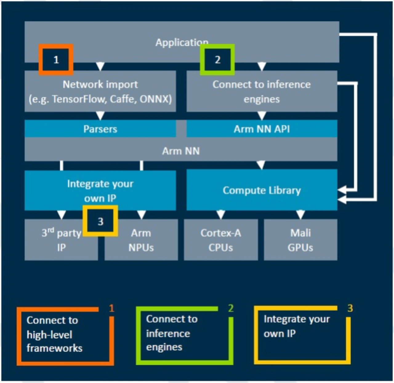 In gewisser Weise verfolgt Arm mit ArmNN den gleichen Ansatz, den Nvidia mit seiner Cuda-Plattform verfolgt, die auf eine Reihe von GPUs abzielt. Diese GPUs sind ähnlich, haben aber jeweils kleine Unterschiede, die durch die Cuda-Unterstützung verdeckt sind. Ein eigenes Framework macht es für Entwickler schwer, auf verschiedene Plattformen zu wechseln. Cuda beherrscht mehr als nur künstliche Intelligenz (AI) und ML-Anwendungen. Entwickler, die auf ML-Tools wie TensorFlow abzielen, können normalerweise von Plattform zu Plattform wechseln, einschließlich des ML-Prozessors von Arm. Bild 4 zeigt Arm NN im Systemkontext.