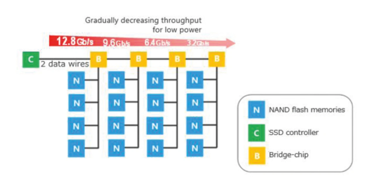 Die Einführung eines Brücken-Chips hilft bei der Realisierung einer hohen Dichte, die den SSD-Controller mit einer Reihe von NAND-Flash-Speichern über nur zwei Datenleitungen in einer Daisy-Chain-Topologie verbindet, eine für den Downlink und die andere für den Uplink. Darüber hinaus ermöglicht eine neuartige Signalisierungstechnologie eine Verringerung der Bandbreite bei jeder Stufe der verketteten Brücken-Chips zur Leistungsreduzierung (Bild 7).
