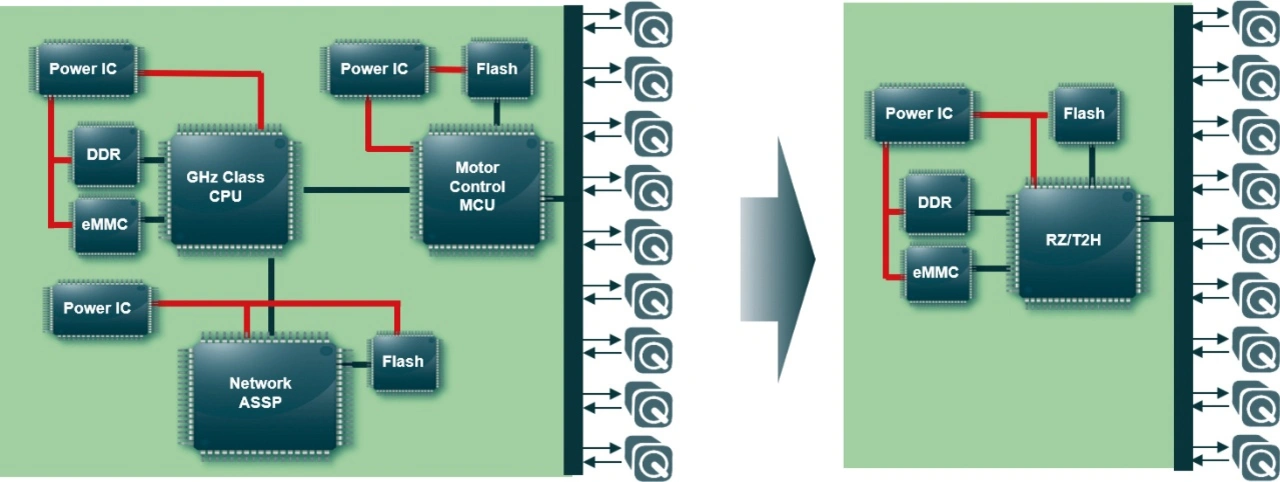 Der RZ/T2H ist mit den oben aufgeführten PWM-Timern, Delta-Sigma-Modulatoren und Encoder-Schnittstellen ausgestattet – und das für insgesamt neun Achsen. Die PWM-Timer dieser neun Achsen können synchron betrieben werden. Die Encoder-Schnittstelle unterstützt zudem mehrere Protokolle. Durch den Einsatz des RZ/T2H, der sowohl eine hohe Echtzeitverarbeitung als auch eine umfangreiche Peripherie für die Motorsteuerung bietet, lassen sich nun die Anzahl der benötigten Komponenten und die Leiterplattengröße reduzieren. Außerdem entfällt der Aufwand für die Implementierung entsprechender Funktionen in einem FPGA, wodurch sich auch die Entwicklungszeit deutlich verringert.