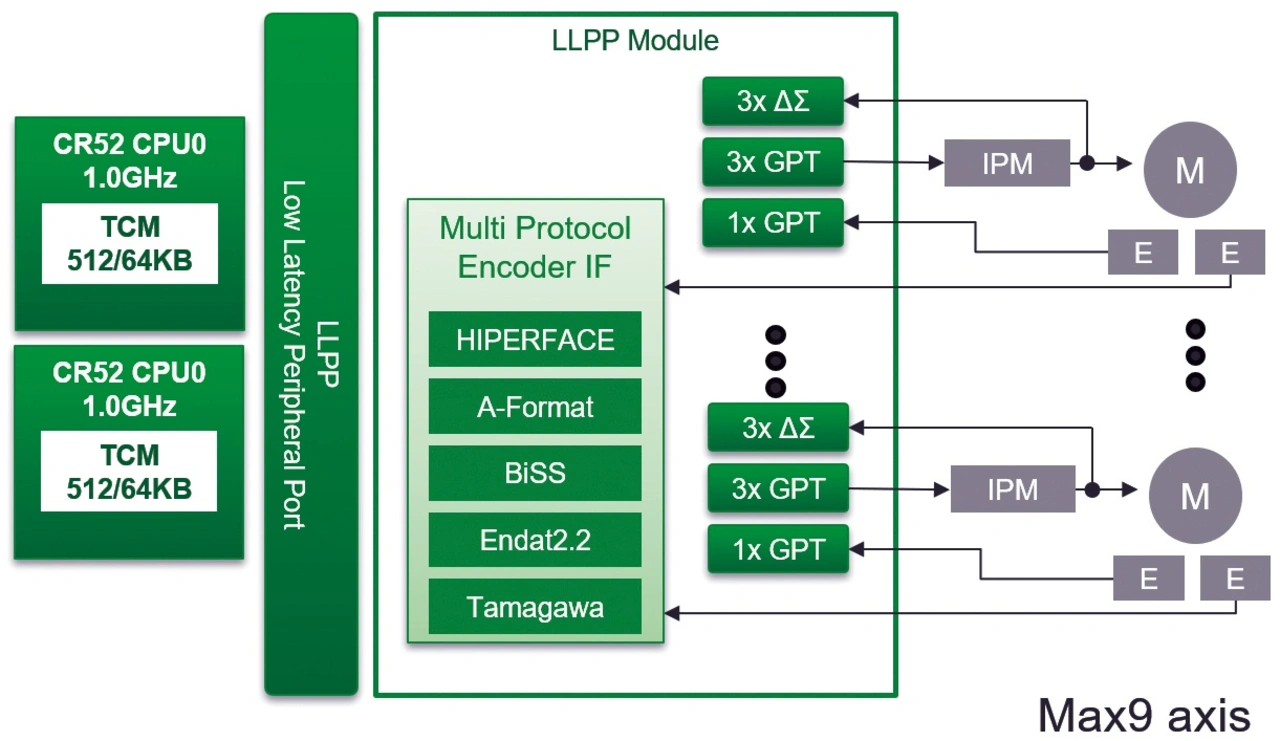 Die RZ/T2H-MPU enthält zwei Cortex-R52-CPUs für Echtzeitanwendungen, und jede CPU arbeitet mit einer Taktfrequenz von 1 GHz und stellt einen großen, direkt angekoppelten Speicher (576 KB) bereit. Dieser vermeidet Laufzeitschwankungen, wie sie bei der Verwendung von Cache-Speichern auftreten, und ermöglicht eine äußerst schnelle deterministische Reaktion. Darüber hinaus befinden sich die trigonometrische Funktionseinheit (TFU) und die für die Motorsteuerung relevante Peripherie am LLPP-Bus (Low-Latency Peripheral Port), der direkt mit der CPU verbunden ist. Dies gewährleistet einen sehr schnellen Zugriff durch die CPU und eine besonders schnelle Ausführung der Stromregelungsschleifen-Algorithmen. Ein Beispielprogramm von Renesas zeigt, wie eine einzelne CR52-CPU die Stromregelung für neun Achsen in weniger als 8 µs ausführen kann. Damit ist mit dem RZ/T2H eine Trägerfrequenz von 100 kHz (=10 µs) erreichbar. Somit können Entwickler mit nur einer CR52-CPU des RZ/T2H die Motorsteuerung für neun Achsen übernehmen, während die zweite CR52-CPU die Industrial-Ethernet-Kommunikation übernimmt.