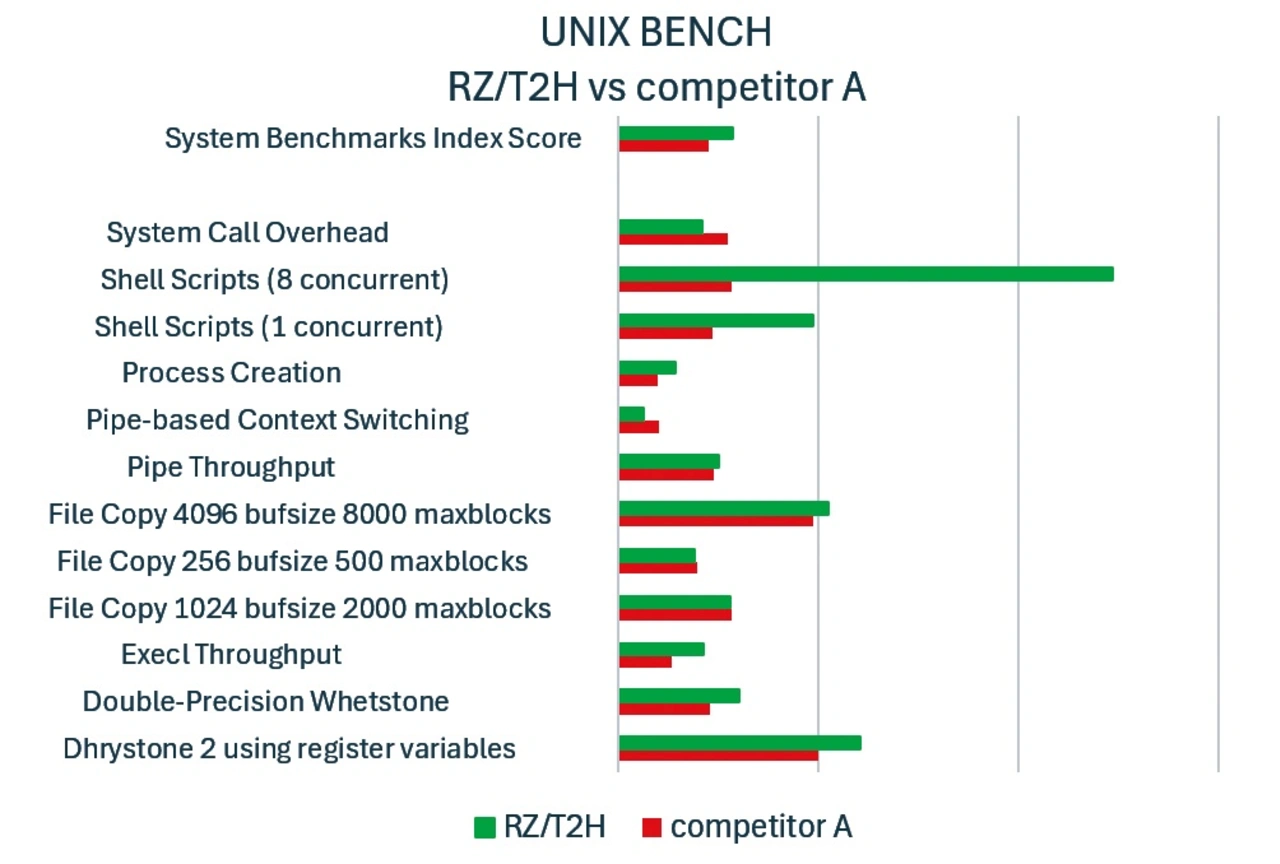 Die folgende Grafik zeigt die UNIXBENCH-Ergebnisse unter Linux, ausgeführt auf einem RZ/T2H und einem Mikroprozessor eines anderen Herstellers mit vier Applikations-CPUs. Die Ergebnisse veranschaulichen, dass der RZ/T2H je nach Anwendungsfall um 35 bis 75 Prozent bessere Werte erzielen kann. Mit dem Einsatz des RZ/T2H lässt sich der Aktualisierungszyklus der Sollwerte für die einzelnen Achsmotoren beschleunigen, und es können komplexere Algorithmen zur Trajektorien-Planung verarbeitet werden. Dadurch ist eine präzisere Roboterbewegung realisierbar.