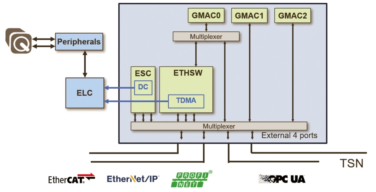 Darüber hinaus sind die Netzwerksynchronisationssignale des ETHSW, abgeleitet von der TDMA-Einheit (Time Division Multiple Access), und die Distributed-Clock-Funktion (DC) des ESC mit dem Event Link Controller (ELC) des RZ/T2H verbunden. Dadurch können Peripheriefunktionen mit geringer Latenz gesteuert und Abläufe mit anderen im Netzwerk verbundenen Bauteilen synchronisiert werden. Dies ermöglicht die hochpräzise Synchronisierung und koordinierte Abläufe mit anderen Netzwerkkomponenten – und trägt so wesentlich zur Steigerung der Produktivität bei.