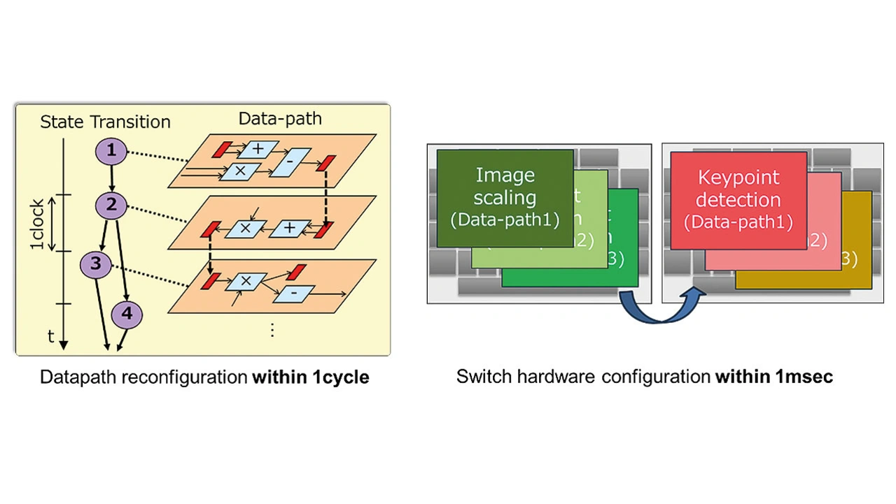 Wie Bild 1 zeigt, kann der DRP Anwendungen ausführen und dabei die Schaltungskonfiguration der Recheneinheiten auf dem Chip bei jedem Betriebstakt entsprechend dem zu verarbeitenden Inhalt dynamisch schalten. Der DRP verbraucht weniger Strom als eine CPU und kann eine höhere Geschwindigkeit erreichen, da nur die erforderlichen Rechenschaltungen genutzt werden. Im Vergleich zu CPUs, deren Leistung durch häufige externe Speicherzugriffe aufgrund von Cache-Fehlern und anderen Faktoren beeinträchtigt wird, kann der DRP außerdem die erforderlichen Datenpfade in Hardware aufbauen. Dadurch lassen sich Leistungseinbußen minimieren und Schwankungen der Betriebsgeschwindigkeit (Jitter) aufgrund von Speicherzugriffen verringern.