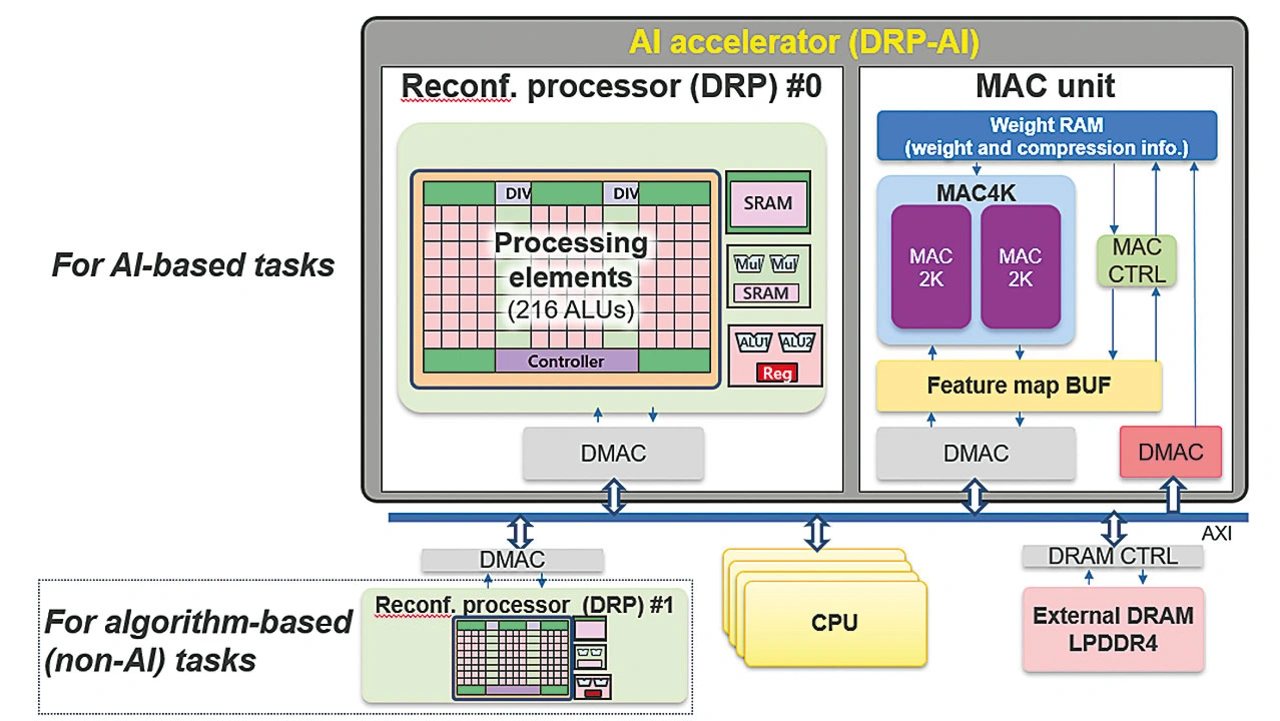 Serviceroboter beispielsweise benötigen eine hochentwickelte KI-Verarbeitung, um die Umgebung zu erkennen. Andererseits ist auch eine algorithmusbasierte Verarbeitung ganz ohne KI erforderlich, um das Verhalten des Roboters zu bestimmen und zu steuern. Aktuelle Embedded-Prozessoren (CPUs) verfügen jedoch nicht über ausreichende Ressourcen, um diese verschiedenen Verarbeitungsarten in Echtzeit durchzuführen. Renesas hat dieses Problem durch die Entwicklung einer heterogenen Architektur gelöst. Hierbei arbeiten der dynamisch rekonfigurierbare Prozessor (DRP), der KI-Beschleuniger (DRP-AI3) und die CPU zusammen.