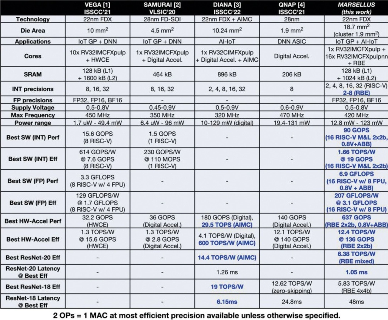 M&L-beschleunigte Kernel erreichen eine Auslastung der MAC-Einheiten von bis zu 94 Prozent, das sind 67 Prozent mehr als bei Ansätzen, die nicht auf eine Fusionierung von M&L setzen. Jeder »XpulpNN-RISC-V-Core« braucht 78 kGE (kilo-gate equivalent), also 17,5 Prozent mehr Fläche als ein Basis-RISC-V-Core, aber diese Cores zeichnen sich durch eine Leistungssteigerung mit einem Faktor von bis zu 12,7 gegenüber anderen RISC-V-Kernen für kleine Bitbreiten aus. Die speziellen RISC-V-Kerne teilen sich außerdem acht FPUs, die die Formate »FP32«, »FP16« und »BF16« unterstützen.