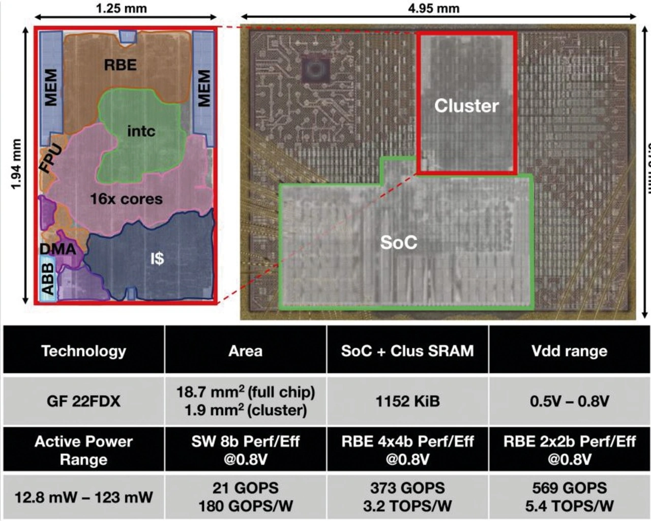 Die Cores und die RBE teilen sich dasselbe 128 kB große L1-SRAM (TCDM: Tightly Coupled Data-Memory). Der TCDM ist in 32 Bänken organisiert, auf das über ein Interconnect mit einer aggregierten Gesamtbandbreite von 400 Gbit/s bei 420 MHz mit 0-Wait-States zugegriffen werden kann. Das Cluster umfasst auch einen DMA-Controller mit einem Durchsatz von 64 bit/Zyklus (sowohl beim Lesen als auch beim Schreiben), der den Datentransfer zwischen L2- und L1-Caches übernimmt. Die RISC-V-Cores unterstützen dank der benutzerdefinierten ISA-Erweiterung »XpulpNN« auch kleine Bitbreiten (2, 4, 8 bit) sowie, wie bereits erwähnt, fusionierte M&L-Befehle.