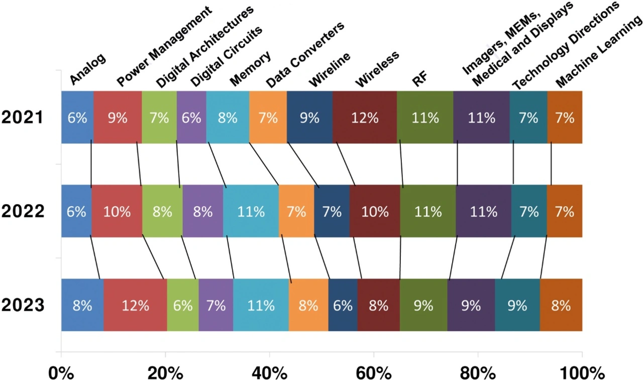 Laut Bruce Rae, Chair des ISSCC European Regional Committee, kamen 27 Vorträge aus Europa, was einem Anteil von 14 Prozent entspricht. Die meisten Vorträge (129 Paper) kommen aus Fernost, gefolgt von Nordamerika mit 42 Vorträgen. Auf die übergeordneten Themen bezogen, die in verschiedenen Sessions diskutiert werden, ergibt sich folgendes Bild: Der größte Anteil der angenommenen Vorträge kommt aus dem Bereich Power-Management (12 Prozent), gefolgt von Memory (11 Prozent). Die Themen HF, »Imagers/MEMS/Medical and Displays« sowie Technology-Directions steuern jeweils 9 Prozent bei, gefolgt von Analog, Wireless und Machine-Learning mit jeweils 8 Prozent. Aus dem Bereich »Digital Circuits« kommen 7 Prozent der Vorträge, auf »Digital Architectures« und Wireline entfallen jeweils 6 Prozent der Vorträge.