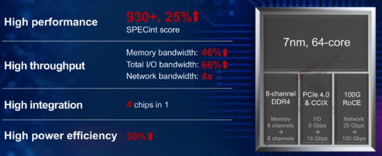 Kunpeng 920 ist die leistungsstärkste ARM-basierte Server-CPU der Branche, wobei es eigentlich SoC statt CPU heißen müsste. Der in einem 7-nm-Prozess gefertigte Chip wurde von Huawei selbst auf Basis einer ARMv8-Architekturlizenz entwickelt. Die Verbesserung der Rechenleistung wurde u.a. durch verbesserte Algorithmen für die Sprungvorhersage, mehr Ausführungseinheiten im Backend und eine optimierte Speicher-Subsystemarchitektur erzielt. 64 CPU-Cores werden von einem Acht-Kanal-Speicherinterface unterstützt, das maximal DDR4-2933 ansteuern kann, die Bandbreite ist mit rund 1,5 TByte pro Sekunde vierfach so hoch wie noch beim Vorgänger. PCI Express 4.0 ist ebenfalls mit von der Partie, viele zuvor extern benötigte Chips für LAN, SAS-Controller sowie Funktionen einer Southbridge sind zudem fortan direkt im Kunpeng 920 integriert.