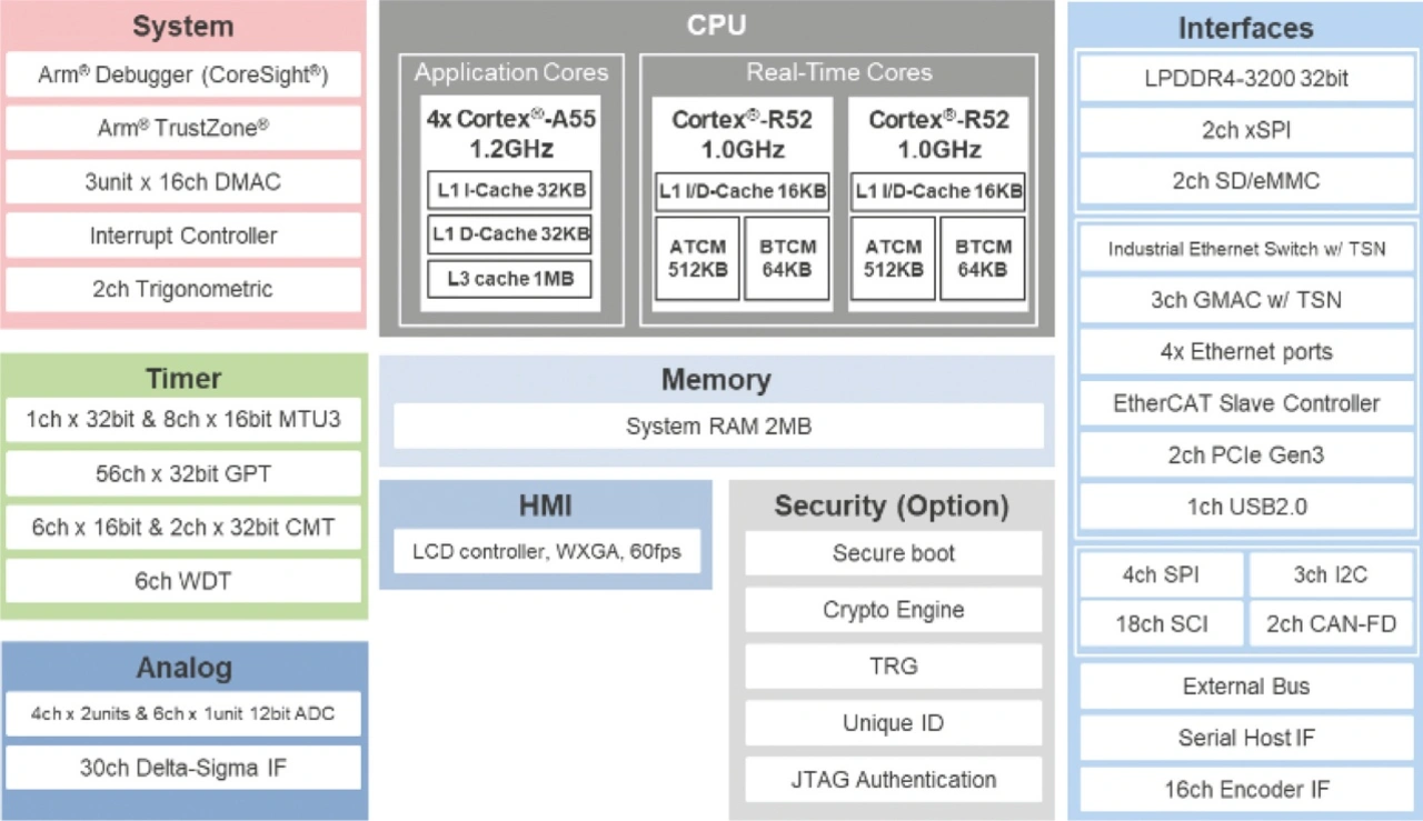Die Mikroprozessoren basieren auf den Cortex-A55- und Cortex-R52-Prozessorkernen und sind damit laut Dettmer leistungsfähiger als konkurrierende Bausteine. Das belegen entsprechende Benchmarks: »Der RZ/T2H mit seinen Cortex-A55-Prozessorkernen schneidet im Vergleich zu Wettbewerbern mit Cortex-A53-Kernen beim Unix-Bench deutlich besser ab, im besten Fall um einen Faktor von fast 4,5.« Auch im Echtzeitbereich käme Renesas auf bessere Ergebnisse: Dank des Cortex-R52-Prozessorkerns kommt der Prozessor im Vergleich zu Varianten mit R5-Core auf eine Rechenleistung, die um den Faktor 1,7 bis 2,1 höher ist.