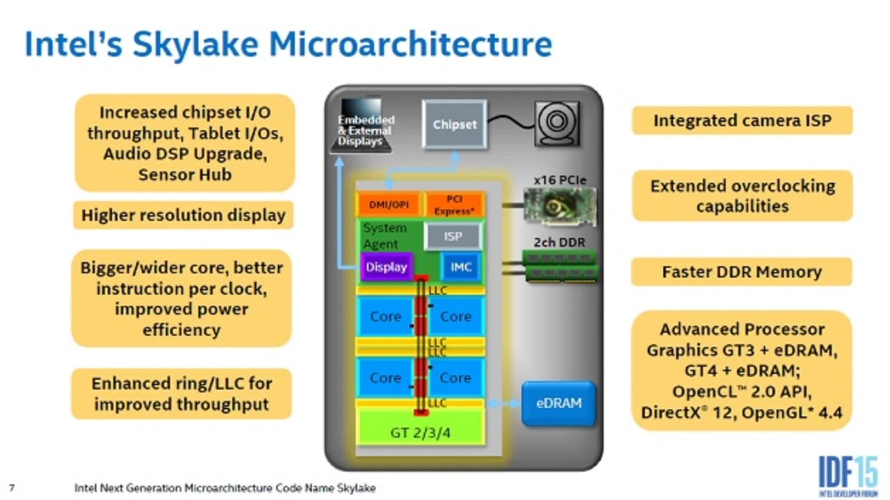 Entwickelt wurde die Skylake-Architektur vier Jahre lang im Design-Center in Haifa. Die Chips werden wie auch die vorangegangenen Generationen mit vier unterschiedlichen Maskensätzen gefertigt, um damit der unterschiedlichen Anzahl von CPU-Cores (2 oder 4) und Ausführungseinheiten der GPU (GT2, GT3e und neuerdings GT4e) Rechnung zu tragen. Ein weiteres Differenzierungsmerkmal der unterschiedlichen Modelle ist das Embedded-DRAM, das 64 MB bei GT3e bzw. 128 MB bei GT4e groß ist. Wie Bild 2 zusätzlich zeigt, liegt der L3-Cache auf dem Chip anders als bislang jeweils um ein Core-Paar herum. Hinzugekommen ist ein Bildsignal-Prozessor (ISP) on Chip für bis zu vier Kameras und Bildsensoren mit bis zu 13 Megapixeln.