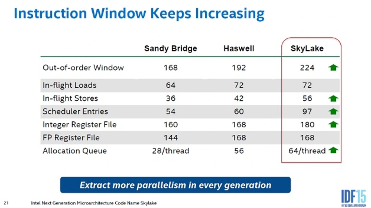 Hinsichtlich der Offenlegung von Details der CPU-Cores hielt sich Intel merklich zurück. Klar ist, dass die Sprungvorhersage mehr Einträge beinhaltet und die Prefetch-Stufen Daten schneller in die Caches übertragen können. Der Puffer für die sogenannten Mikro-Ops, in welche komplexe x86-Instruktionen übersetzt werden, soll hingegen weiterhin 1.500 Einträge umfassen. Mehr Einträge beinhaltet hingegen der Puffer für die Out-of-Order-Befehlsausführung (224 statt 192 bei Haswell, Bild 3), was zu einer besseren „Fütterung“ der einzelnen Ausführungseinheiten führt. Auch die Reservation-Station, in welcher die an die einzelnen Ausführungseinheiten zu übergebenden Instruktionen bis zu ihrer Verteilung zwischengespeichert werden, kann mit 97 mehr Einträge als jemals zuvor aufnehmen. Statt 168 gibt es jetzt 180 Integer-Register, was natürlich die Zugriffe auf Caches und externen Speicher reduziert, da mehr Variablen in Registern gespeichert werden können. Ein Blick auf den Die zeigt jedoch auch, dass die CPU-Cores dank dieser ganzen Maßnahmen enorm an Fläche (und Transistoren) zugelegt haben. Aus der Reservation-Station können übrigens wie beim Vorgänger Haswell bis zu sechs Mikro-Ops pro Taktzyklus an die Ports verschickt werden.