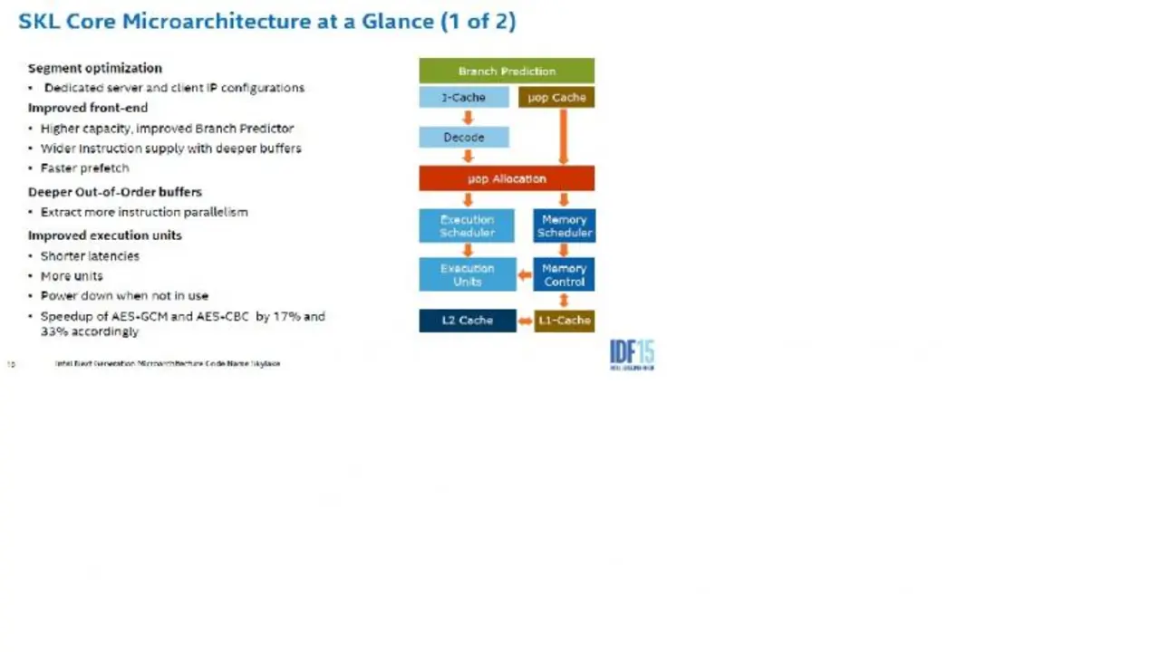 Bild 4 fasst den generellen Aufbau grob zusammen, was allerdings insofern wertlos erscheint, da dieser seit der Vor-Vorgängergeneration „Sandy Bridge“ unverändert aussieht – die Unterschiede der einzelnen Mikroarchitekturen liegen eben im Detail, und dies geht aus dieser Grobdarstellung eben gerade nicht hervor. Bedauerlicherweise hat Intel den Aufbau des Backends, insbesondere die Anzahl der Ausführungseinheiten und deren Aufgaben, nicht verraten. Die offizielle Angabe von „mehr als drei Ports“ ist vollkommen wertlos, da schon bei der Haswell-Architektur deren Anzahl von 6 auf 8 erhöht wurde. Tatsächlich wurde in einer IDF-Präsentation mündlich bestätigt, dass die Anzahl der Ausführungseinheiten bei Skylake erhöht wurde, deren Latenzzeiten zudem gesunken sind. Wieviele Taktzyklen jedoch z.B. Integer- oder Gleitkomma-Befehle zur Abarbeitung benötigen, wurde im Detail nicht verraten. Die für Vektoroperationen zuständigen Ausführungseinheiten (AVX2) werden je nach Applikations-Typ entweder extrem oder gar nicht genutzt. Für letztere, zu denen man wohl u.a. die meisten Büroanwendungen zählen darf, wurde eine dedizierte Power-Gating-Funktion implementiert, mit der man die AVX2-Einheiten abschalten und damit die lästigen Leckströme unterdrücken kann. Bemerkenswerte Änderungen gab es bei der Cache-Architektur. Während der L1-Cache mit jeweils 32 KB für Daten und Instruktionen gleich bleib und auch gegenüber Haswell keine Geschwindigkeitssteigerung pro Taktzyklus vermelden kann, arbeitet der 1 MB große L2-Cache statt achtfach-assoziativ nur noch vierfach-assoziativ, um Energie zu sparen. Eigentlich müsste man annehmen, dass hierdurch der Datendurchsatz reduziert würde, aber weit gefehlt: Die Übertragungsrate zwischen dem 4 oder 8 MB großen und von allen Cores geteilten Last-Level-Cache und dem L2-Cache konnte verdoppelt werden, was insbesondere bei Cache-Misses in L1- und L2-Cache zu schnelleren Datenzugriffen führt. Auch die mitunter sehr langen Wartezeiten durch Page-Misses im TLB wurden deutlich verkürzt, der Prefetch verbessert, die Puffer vergrößert. Mehr wollte Intel zur CPU-Seite nicht sagen. Im Vergleich dazu ist die Informationspolitik auf der GPU-Seite extrem offen, selbst wenn hier auch noch einige Details schwammig bleiben.