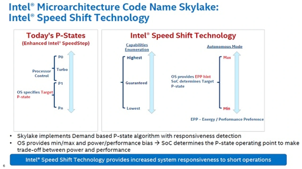 Die alten vom Betriebssystem verwalteten P-States haben mit Skylake ausgedient. Zumindest werden sie nicht mehr benötigt, Skylake kann weitaus schneller mithilfe autonomer Algorithmen in Hardware sowohl für CPU als auch für die GPU die jeweils optimale Taktfrequenz bestimmen. Speed-Shift hat Intel diese Technik getauft (Bild 8). Bisher bestimmte das Advanced Configuration and Power Interface (ACPI) und damit das Betriebssystem, ob der Prozessor mit vollem Takt läuft oder mit niedrigeren Frequenzen. Der Chip selbst konnte bisher lediglich den Turbo oberhalb der Nominalfrequenz festlegen. Unter Windows 10 – und bedauerlicherweise nur mit Windows 10 - übergibt das Betriebssystem nun fast vollständig die Kontrolle an den Prozessor. Das Betriebssystem soll nun eine sogenannte Energy/Performance Preference (EPP) vorgeben, anhand deren der Prozessor dann selbst entscheidet, in welchen P-State er schaltet. Weil dem Prozessor dafür nun die gesamte Bandbreite zwischen Minimaltakt und maximalem Turbo zu Verfügung steht, sollen Systeme noch schneller auf Eingaben reagieren. Die zweite Stromspartechnik namens Duty-Cycling hatten wir schon bei der Vorstellung von Broadwell vorgestellt. Damit kann der Prozessor nun selbständig die Ausführung für kurze Zeit unterbrechen und danach wieder aufnehmen. Trotz der Pausen wird die Aufgabe dabei nicht langsamer abgearbeit, weil die Prozessor in den Lastphasen mit höherem Takt läuft. In Summe (Energie = Lesitungsaufnahme x Zeit) wird schlichtweg weniger Energie verbraucht als bei einem Dauerbetrieb mit geringerer Taktfrequenz. Skylake bietet letztlich auch noch Verbesserungen bei den Energiesparmodi, insbesondere wurde der Modus S3 (Suspend to RAM) durch eine neue Funktion mit der Bezeichnung Disconnected Standby ersetzt. Dieser ist eng mit dem mit Windows 8 eingeführten Connected Standby verbunden und soll laut Intel ein besonders schnelles Wiederaufwachen ermöglichen–laut Intel weniger als eine halbe Sekunde im Vergleich zu ein bis drei Sekunden mit S3. Anders als bei Connected Standby hält das System bei Disconnected Standby aber Browser-Tabs oder E-Mail-Eingang nicht auf dem aktuellen Stand.