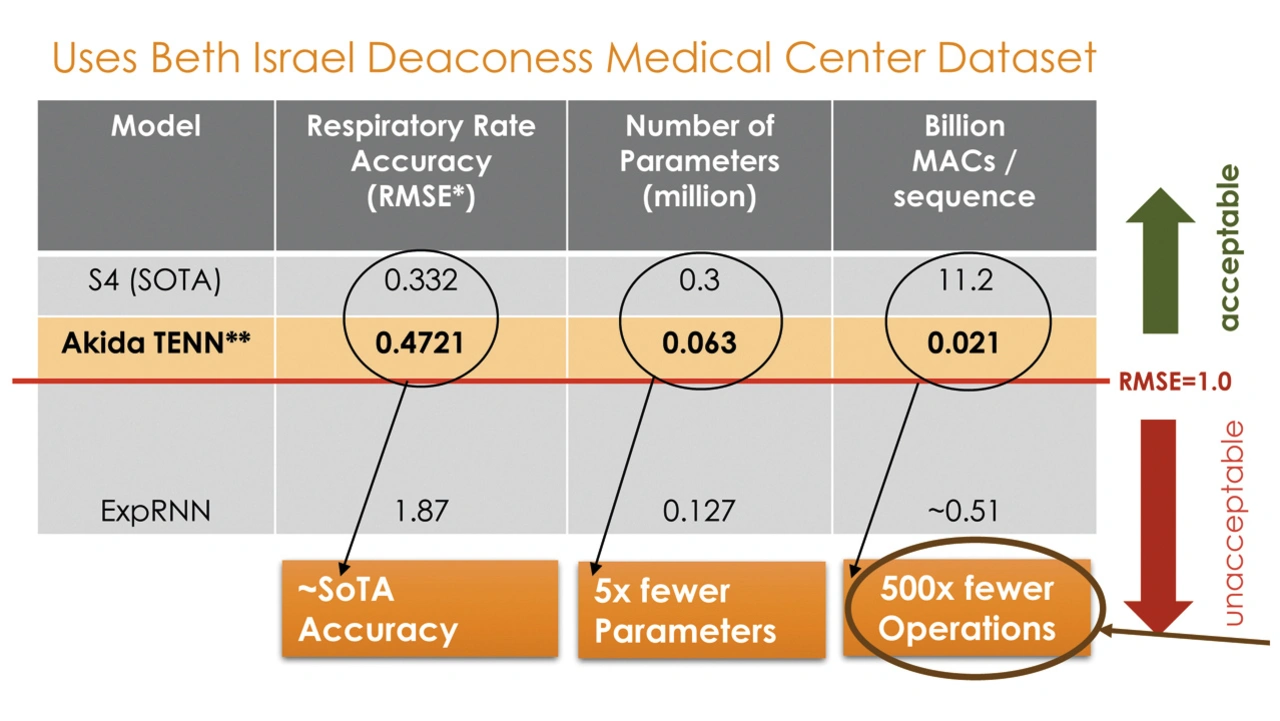 Auch wenn es um das Gesundheitswesen geht, schneidet das Brainchip-IP sehr gut ab. »Wearables oder tragbare Geräte können Vitalsignale wie Herzfrequenz, Atemfrequenz oder Sauerstoffsättigung nur schwer vorhersagen. Und für diese Signalarten funktionieren Vorverarbeitungstechniken wie beispielsweise MFCC nicht sonderlich gut, weshalb typischerweise neuronale Netze genutzt werden, die direkt mit den Rohdaten arbeiten und auf Basis derer Vorhersagen machen können. Darüber hinaus muss in solchen Anwendungen eine hohe Genauigkeit erreicht werden«, erklärt Nayampally. Weil es in diesem Bereich gar nicht so einfach ist, Vergleiche zu ziehen, hat sich Brainchip für einen Datensatz vom Beth Israel Deaconess Medical Center entschieden und die Ergebnisse eines S4-Algorithmus als Vergleich genutzt. Laut Nayampally kommt Brainchip mit TENN bei der Atemfrequenz von der Genauigkeit fast an die Werte mit S4 heran, im Vergleich zu LSTM-basierten Modellen (LSTM: Long-Short-Term-Memory) schneidet Brainchip aber deutlich besser ab. »Wir benötigen aber im Vergleich zu S4 weniger Parameter und deutlich weniger Berechnungen, sodass wir viel effizienter sind«, so Nayampally weiter. Und ähnlich sieht es bei der Herzfrequenz aus, auch hier kommt TENN auf eine ähnliche Genauigkeit wie S4, und das mit deutlich weniger Parametern (Faktor 5) und Berechnungen (Faktor 500). »Also auch in diesem Fall lassen sich mit unserem IP durchaus konkurrenzfähige Mobile/Portable Edge-Geräte realisieren«, so die Überzeugung von Nayampally.