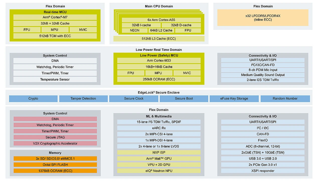 Dazu kommen zwei unabhängige Echtzeitdomänen für Safety-/Low-Power- und High-Performance-Echtzeitanwendungen. Für Safety/Low-Power-Aufgaben steht ein Cortex-M33 zur Verfügung, im zweiten Fall können die Entwickler auf einen leistungsstarken Cortex-M7 (800 MHz) zurückgreifen. Der Cortex-M7 verfügt neben einer FPU auch über eine MPU (Memory Protection Unit) und einen NVIC (Nested Vectored Interrupt Controller) zur Priorisierung von Interrupts, plus jeweils 32 kB Daten/Befehls-Cache und 512 kB TCM mit ECC. Der Cortex-M33 (333 MHz) wartet ebenfalls mit FPU, MPU und NVIC auf, plus jeweils 16 kB Daten/Befehls-Cache und 256 kB OCRAM (On-Chip-RAM) mit ECC.