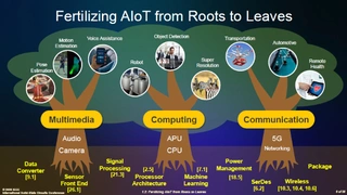Das AIoT umfasst ein breites Spektrum von Technologien, das sich in drei Kategorien einteilen lässt: Multimedia, Computing und Kommunikation (Bild 2). Multimedia besteht im Kern aus Sensoren, Mensch-Maschine-Schnittstellen und Aktoren, die zwischen der digitalen und der realen Welt interagieren. Zudem kann Multimedia Mikrofone und Lautsprecher, Kameras und Displays, Geräte zur Überwachung von Lebenszeichen, Roboterachsen und so weiter umfassen. Die gewaltige Datenmenge wird sowohl lokal als auch in der Cloud verarbeitet, was 5G und andere fortschrittliche Kommunikationstechnologien erfordert, um eine hohe Netzwerkkapazität und einen hohen Datendurchsatz bei geringer Latenz zuverlässig zu unterstützen. Die Eingabedaten in die Cloud und die Edge-KI-Einheiten werden analysiert, klassifiziert und ausgewertet, um kognitive Handlungen mit einer Fähigkeit zu synthetisieren, die die menschlichen Fähigkeiten bis 2030 bei weitem übertrifft. Eine Vielzahl von Technologien wie neuartige Gerätekomponenten, neue KI-Plattformen, heterogene Computereinheiten, fortschrittliche drahtlose und drahtgebundene Kommunikation sowie moderne Packaging-Techniken sind erforderlich, um die Stämme wurzeln zu lassen und das reichhaltige Austreiben der Blätter an der Spitze zu unterstützen.