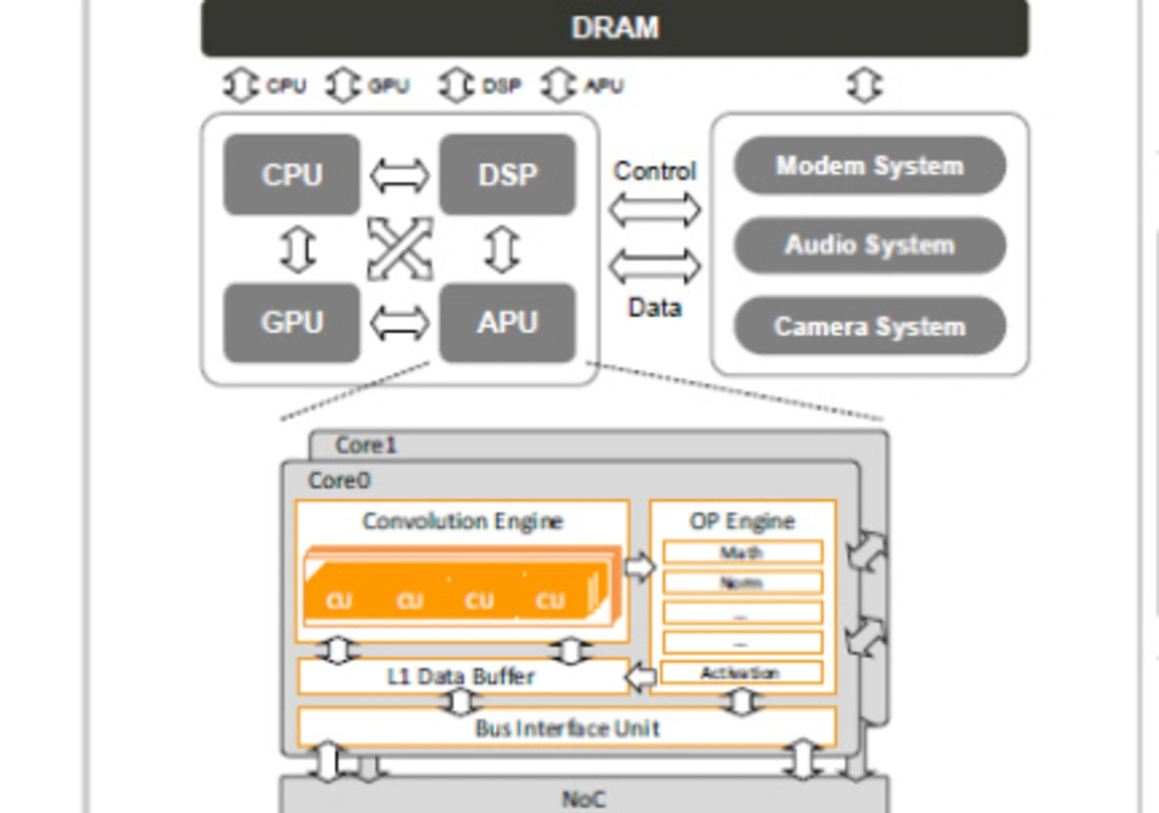 Eine APU dient dem Zweck, dass sie KI-Aufgaben effizient erledigt. Die Blockschaltung zeigt Bild 6. Sie besteht aus Faltungs-Engines, Datenpuffern und Operator-Engines für Operationen in neuronalen Netzen, wie z.B. Pooling und Aktivierung. Eine parallele und skalierbare Rechnerarchitektur mit mehreren APU-Kernen bietet Beschleunigung für häufig verwendete DNN-Operationen. Adaptives Computing wird genutzt, um die Auslastung der ALUs zu erhöhen. Verteilter lokaler Speicher und die Steuerung des Datenflusses ermöglichen die Wiederverwendung von Daten zwischen verschiedenen Faltungsfenstern und neuronalen Netzwerkschichten, wodurch die physische Datenübertragung minimiert wird. Unter APU-Cores und anderen heterogenen Prozessoren werden eng gekoppelte globale Puffer zur gemeinsamen Nutzung von Daten verwendet, so dass der relativ langsame und ineffiziente DRAM-Zugriff reduziert werden kann. Es wird außerdem eine hardwarebasierte Datenkomprimierung eingesetzt, um Rechenressourcen freizusetzen und den Bedarf an Speicherbandbreite zu verringern. Um mit der Sparsamkeit umzugehen, wird die gemeinsame Prozessierung von Hard- und Software entwickelt, um Zero-Skipping zu erreichen. Alle APU-Cores unterstützen verschiedene numerische Darstellungen und eine native asymmetrische Quantisierung, um Leistungsaufnahme und Rechenleistung unter Einhaltung der Zielgenauigkeit auszubalancieren.