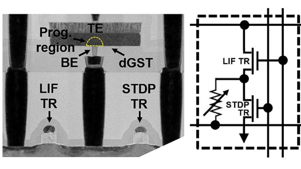 IBM hat für die PCM-Zelle ein 2T-1R-Design, also zwei Transistoren und ein Widerstand gewählt, weil sich laut Kim damit LIF-Neuronen (leaky integrate and fire) sowie verschiedene Regeln für die Anpassung der Synapsenstärken, zum Beispiel STDP (spike-timing dependent plasticity), am effektivsten implementieren lassen. Der letzte Punkt ist eine Voraussetzung, damit die elektrischen Neuronen lernfähig sind. Kim: »Das 2T-1R-Design ist auch hinsichtlich des Platzbedarfs am effizientesten, denn damit sind kleinere LIF-Kondensatoren möglich, wodurch die gesamte Core-Größe kleiner ausfällt. Denn mit diesem Ansatz kann der LIF-Puls deutlich kürzer gehalten werden als der STDP-Puls. Außerdem lassen sich so auch noch zusätzliche Funktionen wie Ionenkanäle oder Verzögerungen in den LIF- oder STDP-Pfad einfügen, ohne dass dadurch der jeweils andere Pfad beeinflusst wird.«