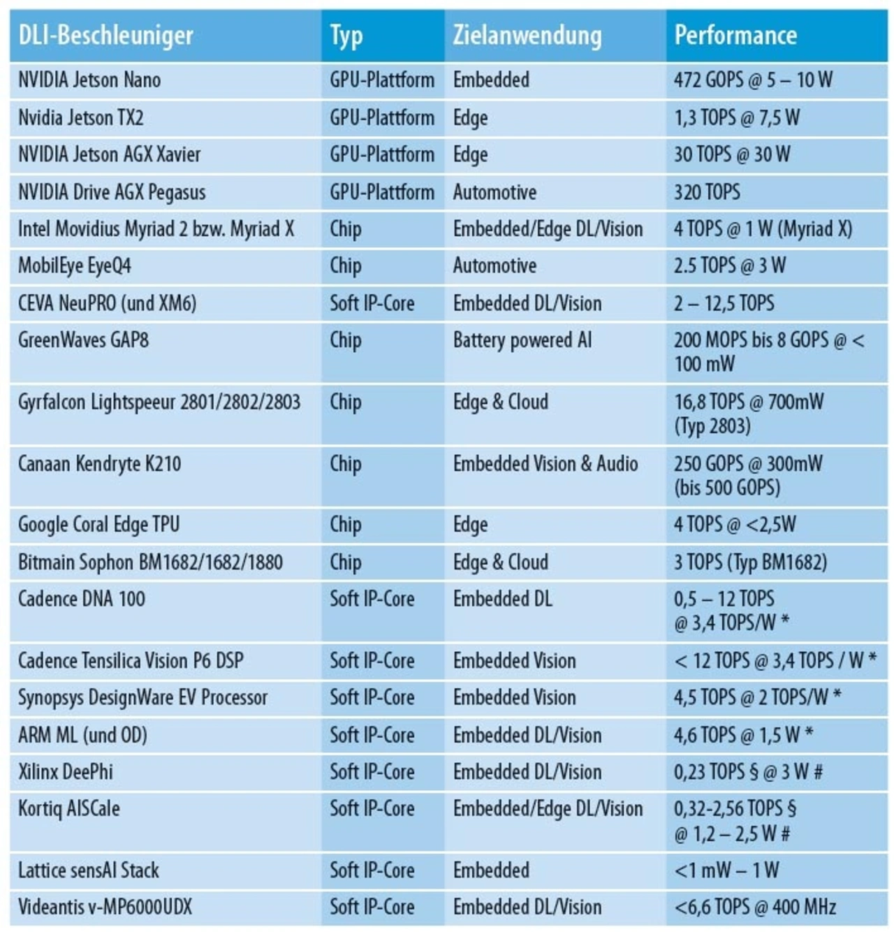 Die neuen KI-Chips und IP-Cores erlauben vielfältige neue Anwendungen jenseits von Desktop-PCs und Servern. In (teil-)autonomen Fahrzeugen der Stufen drei bis fünf werden zukünftig massiv DLI-Systeme zur Umfeldüberwachung und Entscheidungsfindung eingesetzt, um die großen Datenmengen der Radar-, LiDAR (Light Detection and Ranging)- und Kamerasensoren auswerten zu können. Daneben gibt es bereits Künstliche-Intelligenz-Chips (KI) in einigen Mobiltelefonen, Überwachungskameras und Drohnen. Bei letzteren werden Kamerabilder in der Drohne ausgewertet. Dies beweist, wie groß die Rechenperformance in Tera Operations Per Second (TOPS) bei vergleichsweise geringer Leistungsaufnahme ist (s. Tabelle).