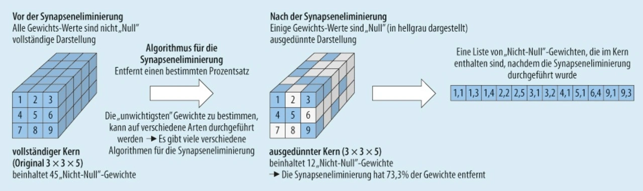 Es ist aber möglich, die für die Speicherung der Gewichte und vorläufigen Feature Maps erforderliche Speichergröße zu reduzieren, indem Deep Compression verwendet wird, das aus mehreren Kompressionsverfahren besteht [4]. Diese Verfahren entfernen einige der Gewichte, in der Regel aus Convolutional und Fully Connected Layern, basierend auf einer Wertung ihrer Bedeutung für den Output des DNN. Weniger wichtige Parameter können entfernt werden, das heißt auf den Wert Null gesetzt werden. Wird dies korrekt durchgeführt, kommt es zu keiner Beeinträchtigung der Klassifizierungsleistung und Genauigkeit des »beschnittenen« Netzwerks. Nachdem der Beschneidungsprozess (Pruning oder Synapseneliminierung) abgeschlossen ist, bleibt eine sogenannte »Sparse Representation« übrig, also eine ausgedünnte Darstellung des DNN (Bild 3).