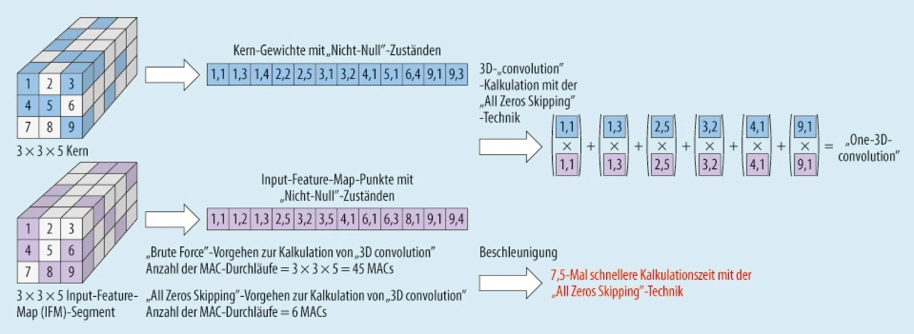 Neben der Reduzierung der erforderlichen Speichergröße und der Datenmenge während der DNN-Berechnung kann die ausgedünnte Darstellung von DNNs und Feature Maps auch dazu verwendet werden, die Inferenz-Geschwindigkeit durch Optimierung des Berechnungsprozesses von Convolutional- und Fully Connected Layern zu beschleunigen. Da in diesen Layern sehr viele Multiplikationen zwischen Input-Werten und Gewichten vorkommen, wird die Berechnung der Produktsumme effizienter, wenn sie alle Gewichte mit Wert Null überspringt (Zero Skipping – siehe Bild 4). Durch diese Begrenzung auf die Durchführung der absolut notwendigen Berechnungen wird eine signifikante Verkürzung der Inferenzdauer bei gleichzeitiger Reduzierung der Leistungsaufnahme erreicht.