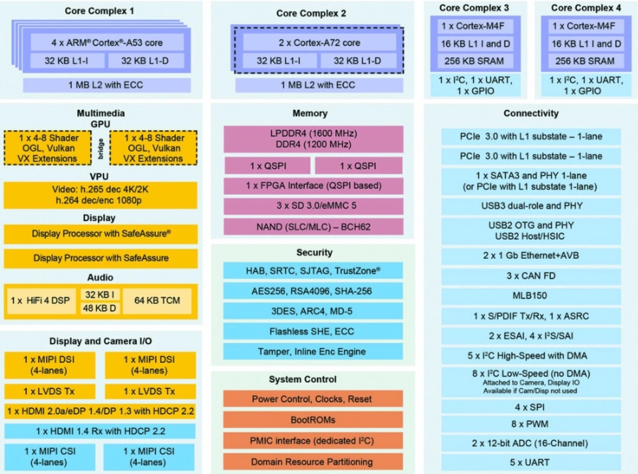 Die beiden größeren Varianten spielen was die Rechenleistung angeht in einer ganz anderen Liga. Zusätzlich implementierte NXP hier noch einen bzw. sogar zwei CPUs des Typs Cortex-A72, die zum Zeitpunkt des Designstarts die Größten aus dem Hause ARM waren, der Cortex-A73 kam leider zu spät. Dass bei 1,5 GHz Taktfrequenz dennoch die Gesamtleistungsaufnahme nicht über 5 W oder 6 W klettert, ist der FDSOI-Fertigung geschuldet. Die i.MX8-SoCs sollen die Anwendungen adressieren, für die die i.MX8M-Derivate einfach zu schwach sind, wie z.B. industrielle HMIs, Single-Board-Computer oder im Automobil Infotainment-Systeme und Head-Up-Displays.