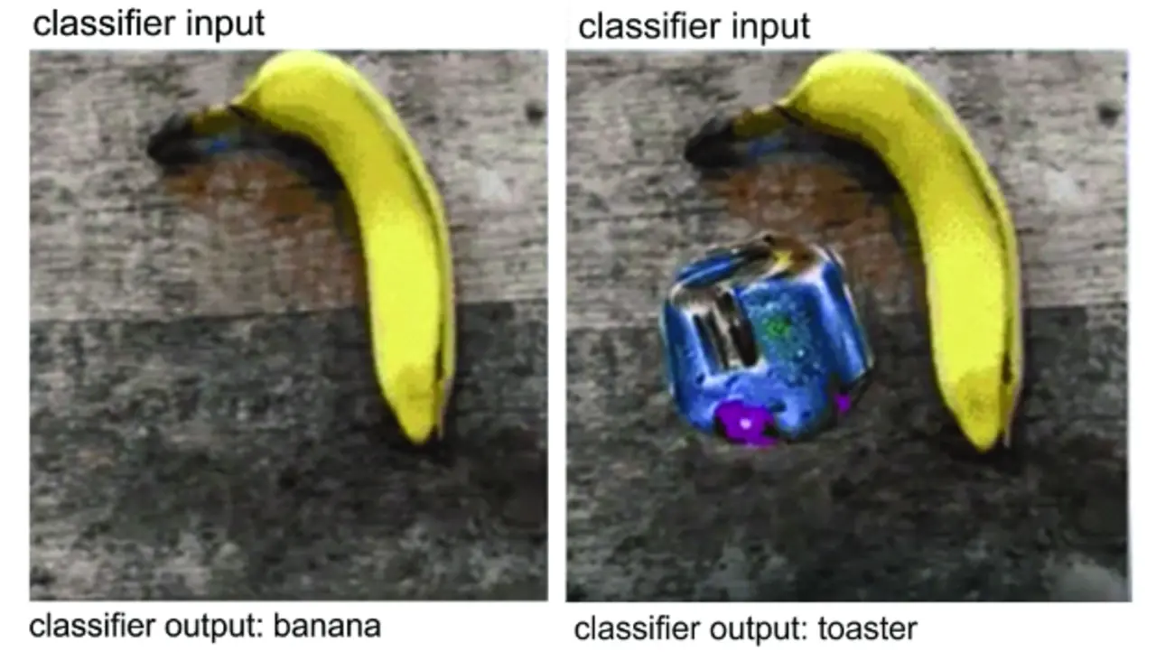 Tatsächlich ist meist völlig unklar, welche Kriterien KNN anwenden, um Entscheidungen zu treffen und Bilder zu erkennen. Dies zeigt sich in ihrer Anfälligkeit für »feindliche Angriffe«, in denen kleine Änderungen an Bildern, wie etwa kleine Aufkleber auf Verkehrsschildern, das Ergebnis von »30 km/h« auf »freie Fahrt« verändern. Ähnlich erkennt ein auf Bananen trainiertes Netzwerk nach Zugabe eines Stickers plötzlich einen Toaster, und niemand weiß warum (Bild 4). Dies mag in diesem Beispiel zwar lustig sein, jedoch wird es ernst, wenn ein selbstfahrendes Auto eine folgenschwere Entscheidung trifft, die keiner ergründen kann.