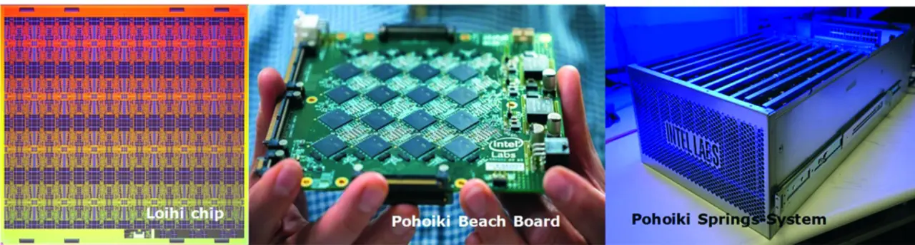 | Intel | Loihi | Digital ASIC, 14 nm CMOS | 130k Neuronen, 130 M Synapsen | 23,6 pJ pro Synapsen-Operation |