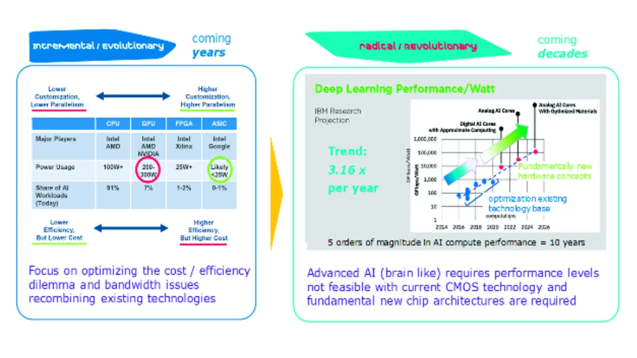 In klassischen KNN laufen alle Rechenprozesse hochparallel und synchron. Diese Anforderungen gleichen in vieler Hinsicht denen von Grafikkarten. Tatsächlich basierten einige der ersten KNN auf modifizierten Grafikprozessoren. Diese können jedoch sehr heiß laufen. Die elektrische Leistungsaufnahme bisheriger KNN war daher enorm. Mit der Entwicklung spezieller ASIC-Schaltkreise wie z. B. der Google TPU oder der Tesla-Selbstfahrchips konnte die Leistungsaufnahme um den Faktor 10 reduziert werden (siehe Tabelle in Bild 2). Gleichzeitig hat sich die Rechenleistung von KI-Chips um etwa den Faktor 3 pro Jahr erhöht.