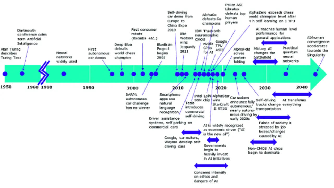 Kaum eine andere Schlüsseltechnologie hat das vergangene Jahrzehnt so geprägt wie künstliche Intelligenz (KI). Bild 1 zeigt, welche Anwendungen mit KI im Laufe der Zeit möglich geworden sind. Die Auswahl bezieht sich auf die technischen Meilensteine sowie besonders öffentlichkeitswirksame Forschungserfolge. Angesichts der vielversprechenden Durchbrüche stellt sich nun die Frage: Was kommt danach? Wenn es nach Zukunftsforschern wie Ray Kurzweil geht, werden Mensch und Computer um 2045 eine Symbiose zu einer Superintelligenz eingehen. Dieser Schritt würde die Welt so grundlegend verändern, dass danach nichts mehr vorhersehbar sein wird. Die Geschwindigkeit der Veränderungen wäre praktisch unendlich. Mathematisch gesehen handelt es sich um eine Singularität. Technologisch betrachtet gilt neuromorphes Computing als einer der vielversprechendsten Kandidaten, um den nächsten großen Entwicklungsschritt der KI praktisch umzusetzen.
