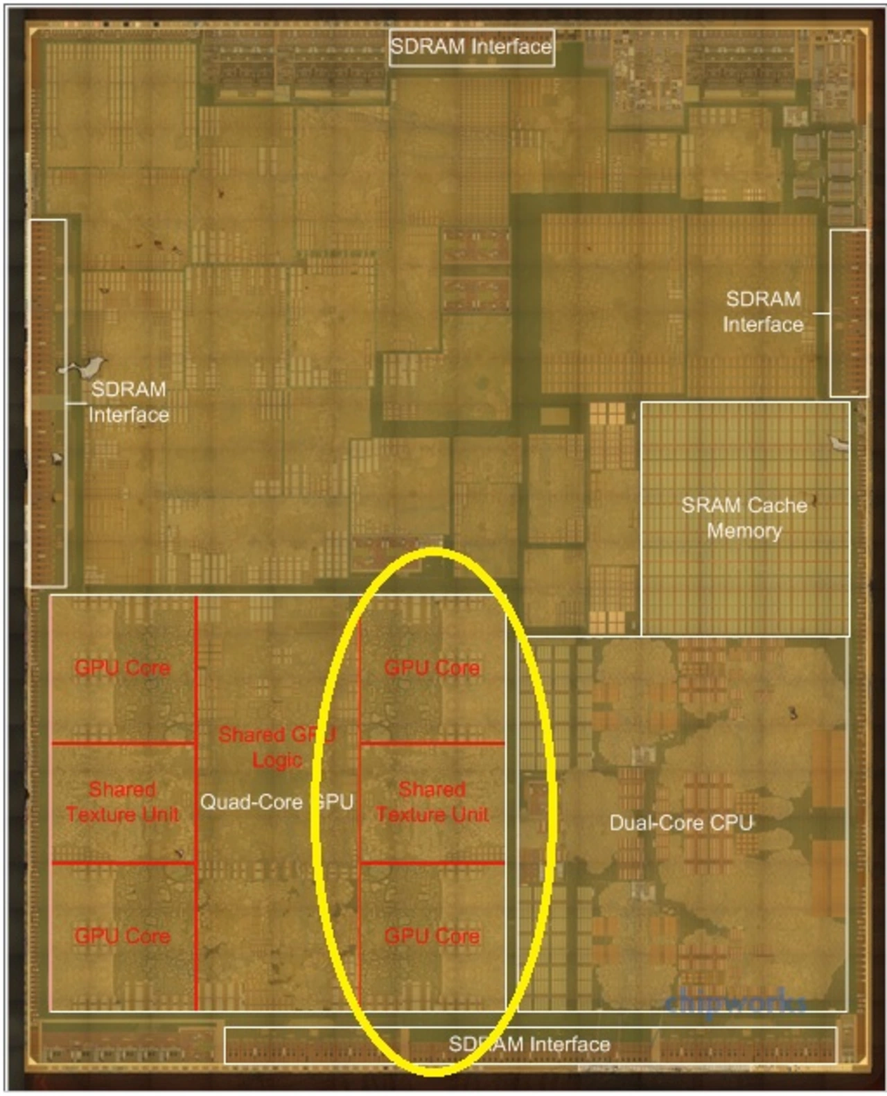 Was allerdings damit nicht erklärt werden kann, ist die Anzahl von zusätzlich 1 Milliarden Transistoren gegenüber dem Apple-A8. Wenn man sich das Schaubild des A8 ansieht, stellt man fest, dass jeweils 2 Cluster der GPU inklusive der geteilten Logik nur rund 10 % der gesamten Die-Fläche belegen (der gelb umrandete Bereich).