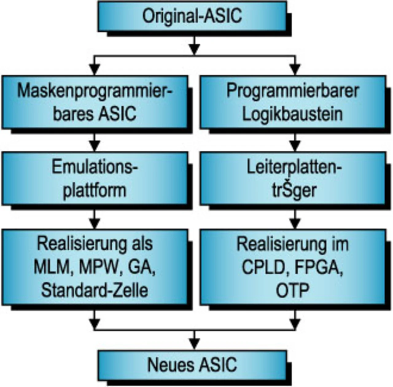 Ein abgekündigtes ASIC muss noch lange nicht das Ende eines erfolgreichen Produktes bedeuten. Hat man vor Jahren sich bewusst gegen einen Standard-Schaltkreis und für ein ASIC entschlossen, so kann das ASIC durchaus nachentwickelt werden, wenn der Halbleiterhersteller die Fertigung dieses ASICs einstellt. Von einer FPGA-basierenden Lösung bis hin zu einem neuen Standard-Zell-ASIC gibt es viele Möglichkeiten. Die Wahl hängt von den Randparametern ab. Dieser Prozess wird auch als Reverse-Engineering, Cloneing, Klonen oder Redesign von ASICs bezeichnet.