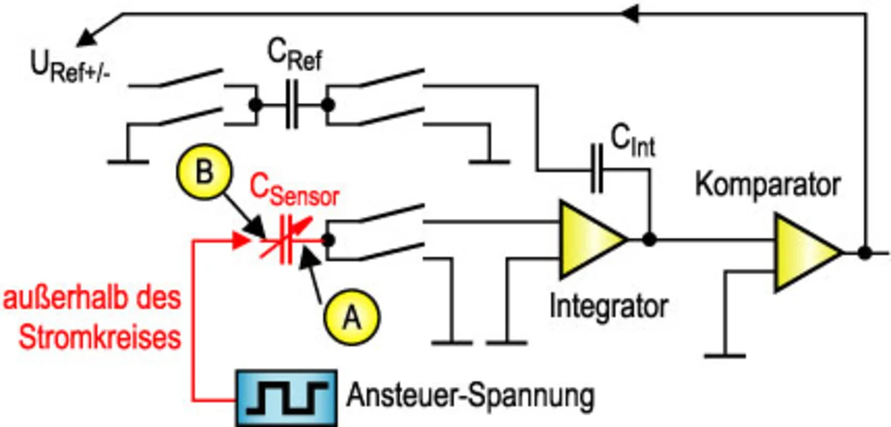 Eine hohe Spannung am Eingang bewirkt also eine hohe Anzahl logischer Einsen, die ihrerseits häufig die (negative) Referenz aufschalten. Diese hohe Dichte der Einsen wird vom nachfolgenden digitalen Filter in einen digitalen Zahlenwert umgewandelt. Ein klassischer Sigma-Delta-ADU vergleicht also eine unbekannte mit einer bekannten Spannung und benutzt dabei zwei bekannte (üblicherweise gleiche) Kapazitäten. Eigentlich werden jedoch Ladungen verglichen, und daher können nach Q = C x U auch die Kapazitäten verglichen werden, wenn beide Spannungen bekannt – in unserem Falle gleich – sind. Im Eingangszweig muss nur ebenfalls ein getaktetes Spannungssignal anliegen, wie in der Prinzipschaltung in Bild 2 dargestellt.
