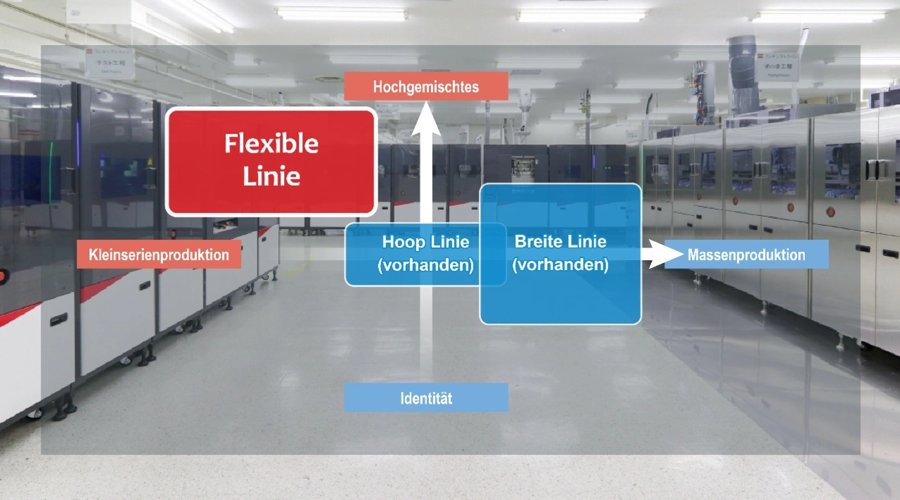 Neben der Massenproduktion gibt es immer mehr Anfragen nach Kleinserienfertigung im Automobil- und Industriemarkt sowie von Kunden, die neue Produkte entwickeln. Deshalb hat ROHM im Jahr 2021 eine „flexible Linie“ eingeführt, die durch die Reduzierung von Qualitätsschwankungen und durch maximale Automatisierung ein qualitativ hochwertiges Design ermöglicht, das sich ideal für die Produktion mit vielen Varianten und geringen Stückzahlen eignet.