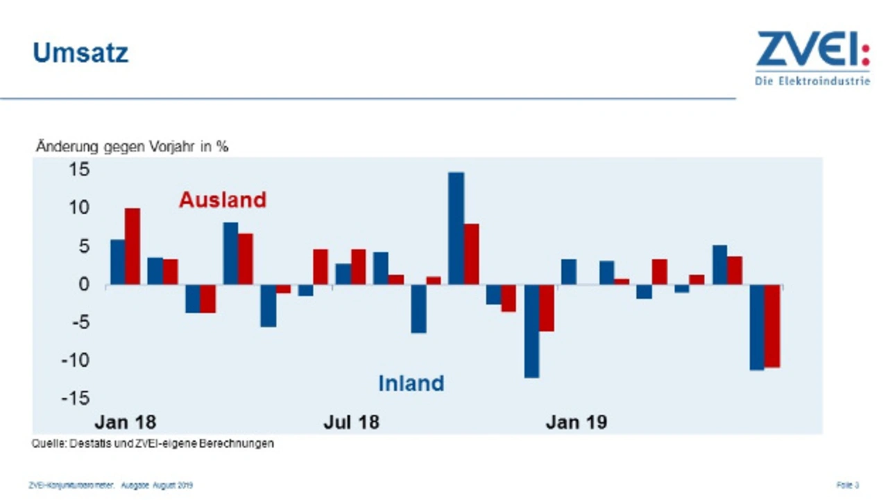 Der nominale Umsatz der deutschen Elektrounternehmen fiel im Juni um 11,1 Prozent auf 14,0 Milliarden Euro. Inlands- und Auslandsumsatz sanken annähernd gleich stark um 11,3 Prozent auf 6,6 Mrd. Euro bzw. um 10,9 Prozent auf 7,4 Mrd. Euro. Die Geschäfte mit der Eurozone gaben um 5,7 Prozent auf 2,9 Mrd. Euro nach, die mit Drittländern um 13,9 Prozent auf 4,5 Mrd. Euro.