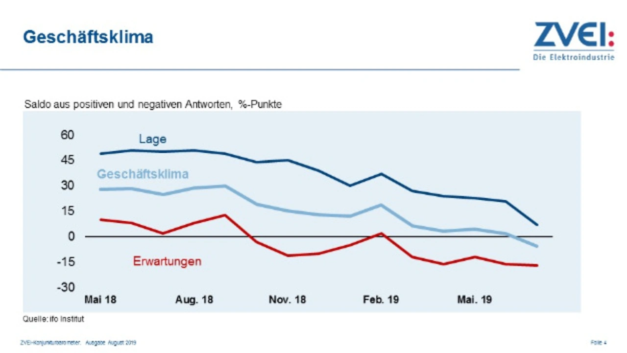 Erstmals seit Oktober 2014 sank das Geschäftsklima in der deutschen Elektroindustrie im Juli unter die Null-Linie. Die aktuelle Lage wurde deutlich schlechter beurteilt als noch im Juni, aber auch die allgemeinen Geschäftserwartungen fielen etwas zurück.