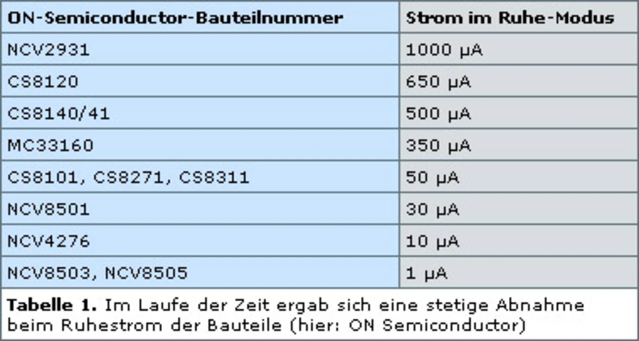 Die neuen linearen Regler-Bauteile sind dazu in der Lage, den Stromverbrauch im Ruhe-Modus von den typischen 150 µA bis hinunter auf 1 µA, abhängig von der IC-Wahl, zu reduzieren. Ein Beispiel dafür sind die neuesten Bauteile NCV8503 und NCV8505 von ON Semiconductor. Der Stromverbrauch im Ruhe-Modus erreicht hier ein absolutes Maximum von 1 µA. Dies ist die Konsequenz aus dem Entwicklungstrend hin zu niedrigerem Ruhestrom (Iq), ausgehend vom Vorgängermodell, dem Sleep-mode-Bauteil NCV8501 mit 30 µA.