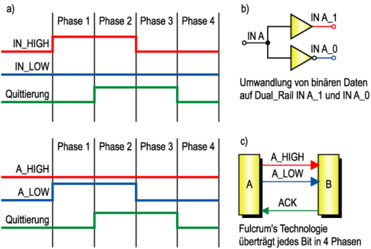 Das Bild einer Reihe von Dominosteinen ist sehr anschaulich, denn es zeigt, wie sich die einzelnen Daten-Bits voranbewegen. Da es keinen übergeordneten Takt gibt, „fallen“ die einzelnen Bits wie Dominosteine in vielen Bitreihen unabhängig voneinander und mit maximaler Geschwindigkeit der eingesetzten Halbleitertechnologie, ohne dass durch eine übergeordnete Synchronisierung Zeit verloren geht.