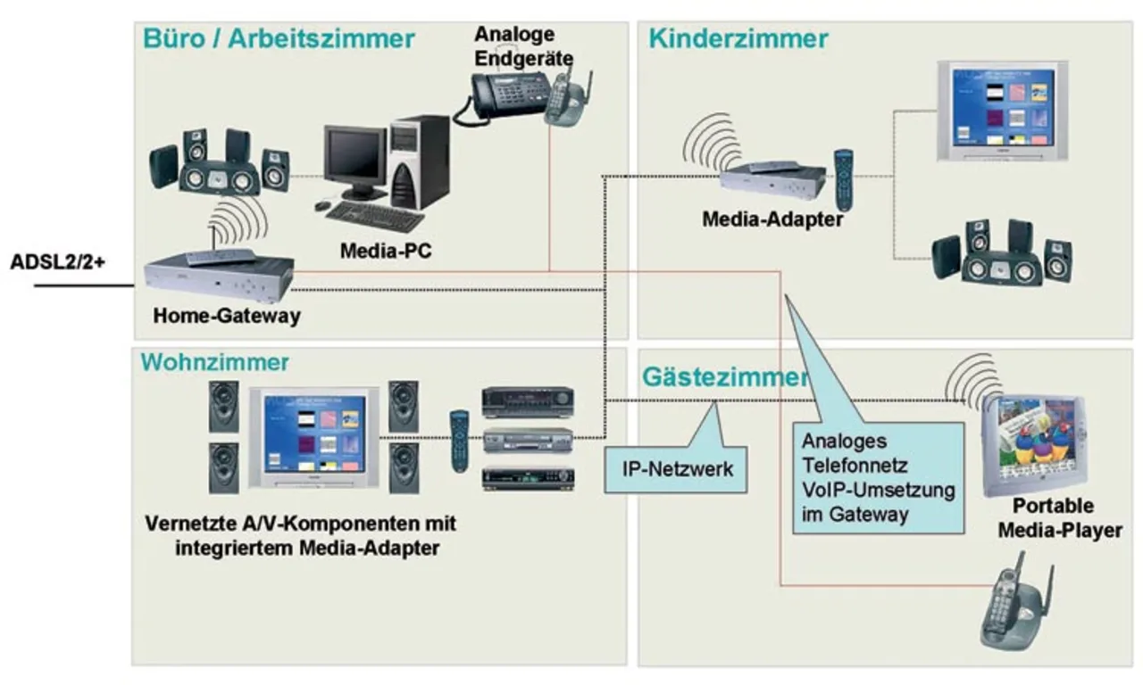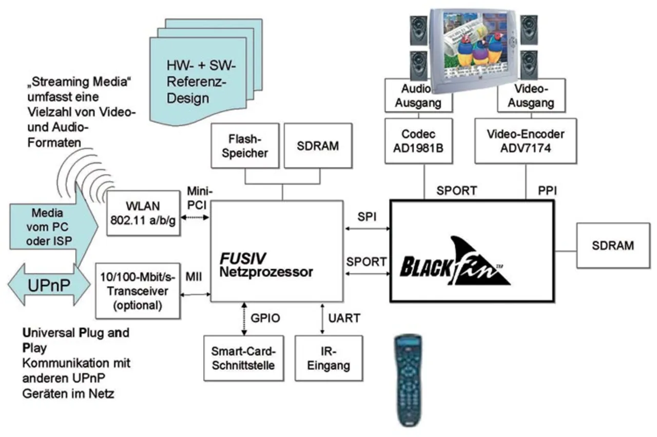Der ADSP-BF561 eignet sich besonders für Produkte wie Digitalkameras, Videokameras, portable Media-Player und drahtlos vernetzbare Geräte, aber auch für neue Geräte oder Anwendungen im Automobilbereich, z.B. zum Einsatz in Fahrerassistenzsystemen. Der folgende Abschnitt erläutert den Einsatz der „Blackfin eMedia Platform“ im Zusammenwirken mit der FUSIV-Netzwerkverarbeitungs-Technologie des Unternehmens in Media-Anwendungen. Die Kombination beider Technologien ermöglicht IP-fähige (Internet Protocol) Endgeräte wie Home-Gateways, Media-Adapter, Consumergeräte (IP-TV) und Set-Top-Boxen, die die unterschiedlichsten Kombinationen an digitaler Unterhaltung und Diensten bereitstellen können. Das vernetzte Haus in Bild 1 ist ein Beispiel dafür.