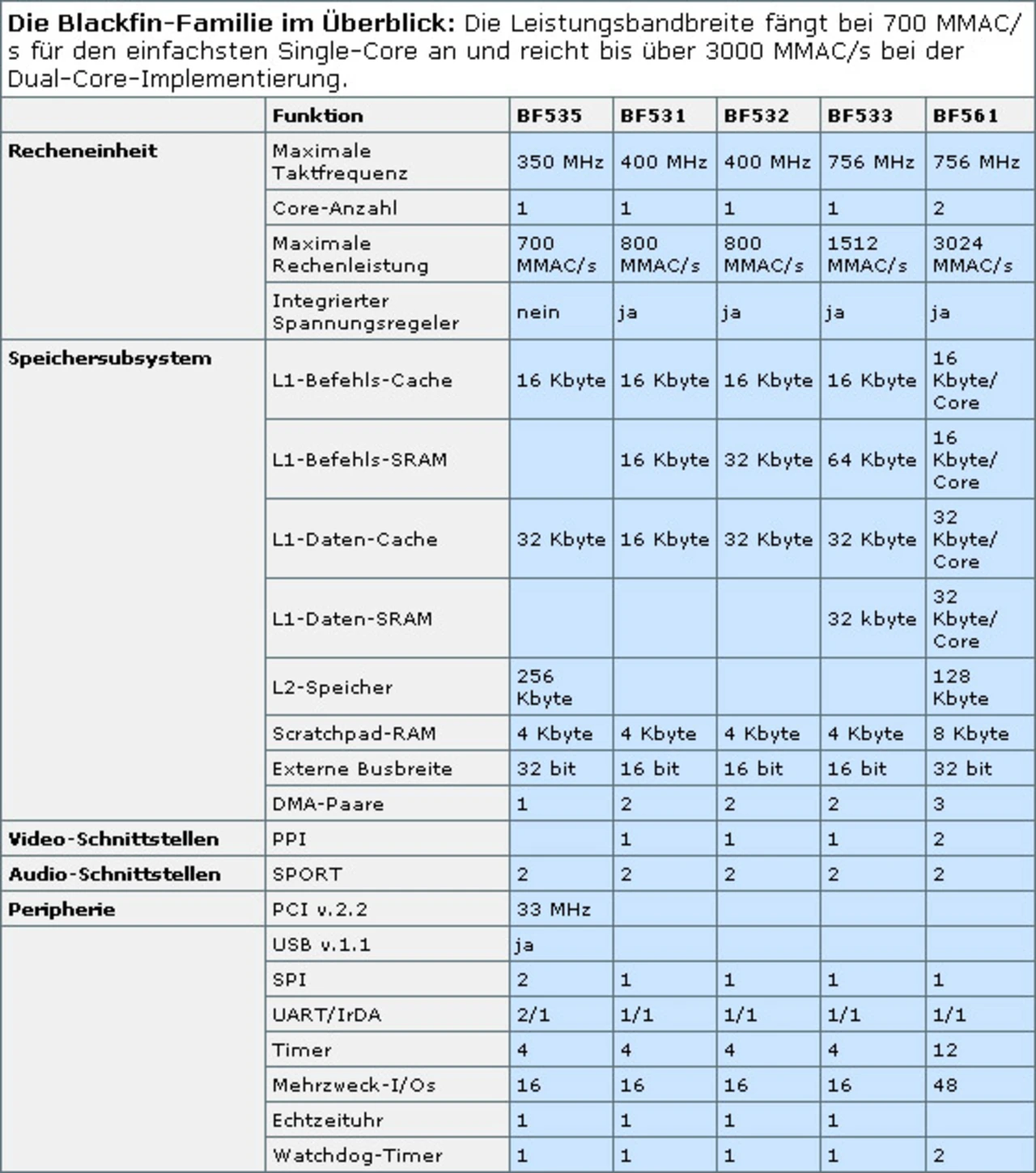 In der Vergangenheit wurden für Decodierer/Codierer häufig ASICs eingesetzt. Zum einen konnte die Stückzahl der Applikationen die Entwicklung eines ASIC rechtfertigen, zum anderen waren programmierbare Lösungen noch nicht leistungsfähig genug. Die Architektur des Blackfin erlaubt es, sowohl DSP-typische Echtzeit-Verarbeitung von digitalen Signalen als auch RISC-typische Rechenoperationen mit ein und demselben Prozessor durchzuführen. So lassen sich Betriebssysteme für Steuer- und Überwachungsfunktionen zusammen mit optimierten DSP-Algorithmen auf einem Prozessor realisieren. Diese Architektur kommt Media-intensiven Anwendungen entgegen, die hochportabel sein sollen und preislich im Verbraucher-Segment angesiedelt sein müssen. Während die Decodierung/Codierung der Daten in herkömmlicher Art über den DSP abgewickelt wird, lässt sich der RISC-Befehlssatz dazu verwenden, um etwa ein Betriebssystem wie Linux mit der Steuerung der Applikation, des Netzwerkverkehrs und des GUI (Grafische Benutzer-Schnittstelle) zu betrauen. Zukünftige Verbraucher-Applikationen für Video und Audio werden ab heute häufiger den Weg der programmierbaren DSP-Lösung beschreiten. Die Architektur des Blackfin wurde speziell für diese Applikationen entwickelt und bietet enorme Vorteile gegenüber einer festen Implementierung in Hardware. Diese Vorteile sind: