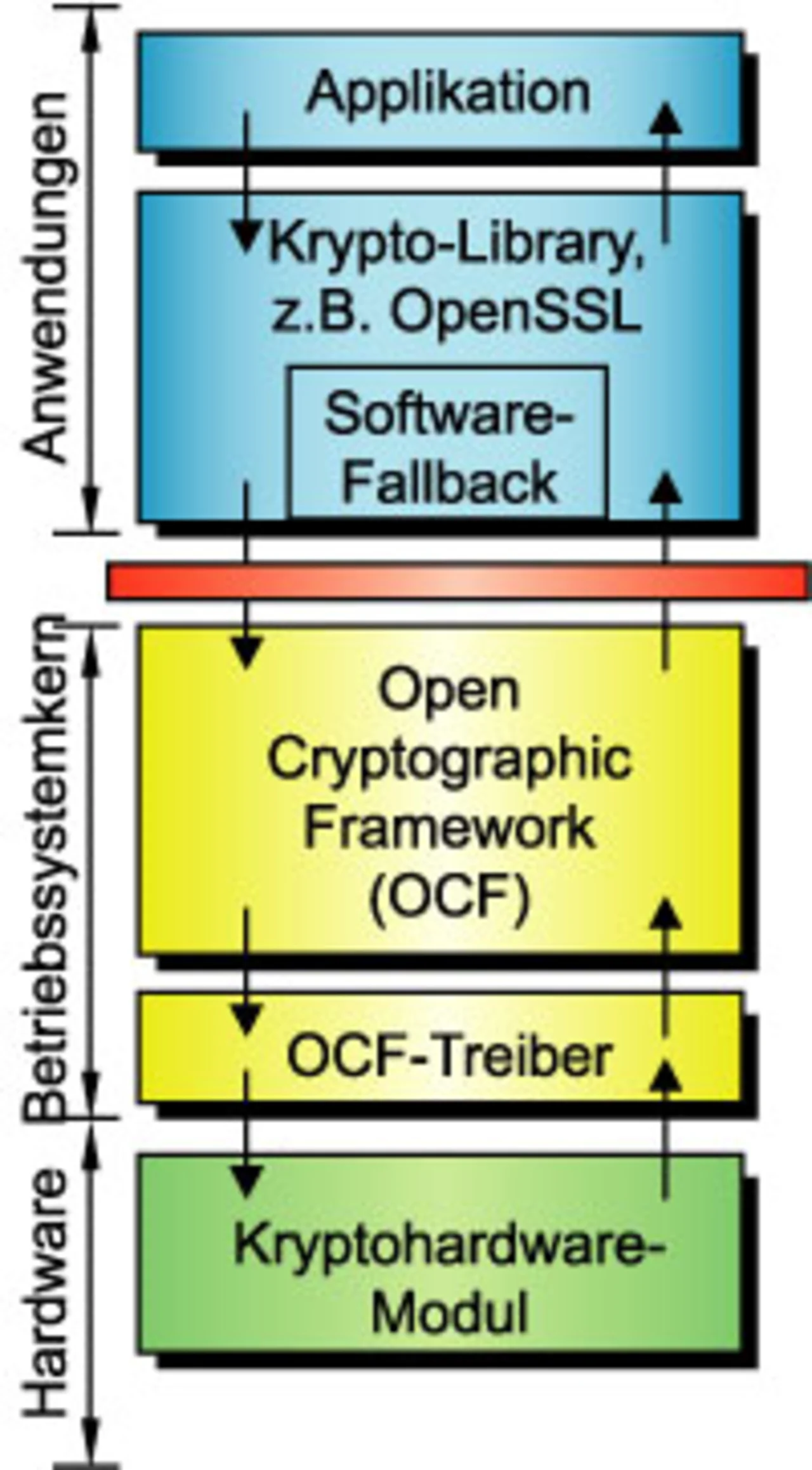 OCF muss aber nicht direkt von der Applikation aus bedient werden. In den meisten Fällen wird eine Library zwischengeschaltet, die als Bindeglied zwischen Applikation und Treiber dient. Diese Aufgabe kann unter anderem auch von OpenSSL übernommen werden (siehe Bild 2). Zum Zeitpunkt der Compilation von OpenSSL muss lediglich angegeben werden, dass OCF verfügbar ist. Alle Befehle, die sich an die Hardware auslagern lassen, werden von OpenSSL dann über OCF an die Hardware weitergegeben. Die Applikation bemerkt davon nichts – die kryptographischen Funktionen bleiben unverändert. Auch bereits vorhandene Applikationen können davon profitieren, ohne dass Anpassungen notwendig sind. Es muss lediglich sichergestellt werden, dass auf eine OpenSSL-Version zugegriffen wird, die OCF unterstützt.