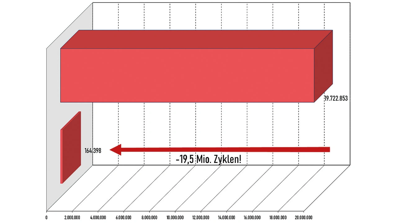 Wenn Miele keine eigenen Qualifikationsuntersuchungen durchführen würde, und den Hersteller mit dem schlechtesten Ergebnis ausgewählt hätte, so würden die ersten EEPROMs bereits nach 23.000 Zyklen ausfallen. Umgerechnet auf die Lebensdauer der Miele Geräte wären somit bereits nach einem halben Jahr die ersten Geräte beim Kunden defekt. Dies konnte mithilfe der Qualifikationsuntersuchungen erfolgreich verhindert werden.